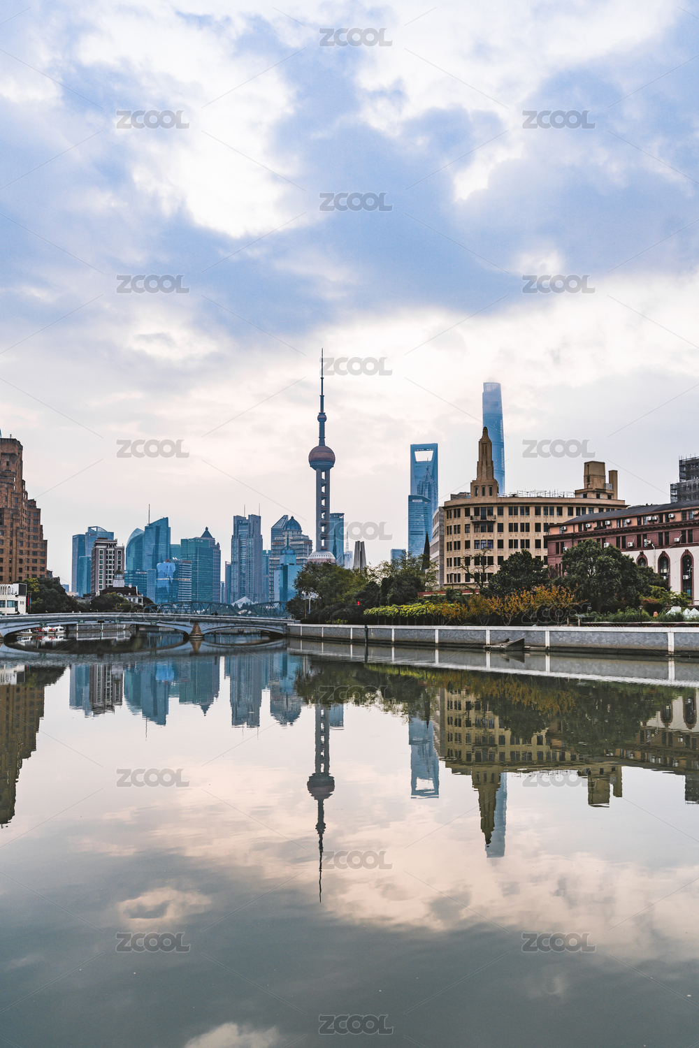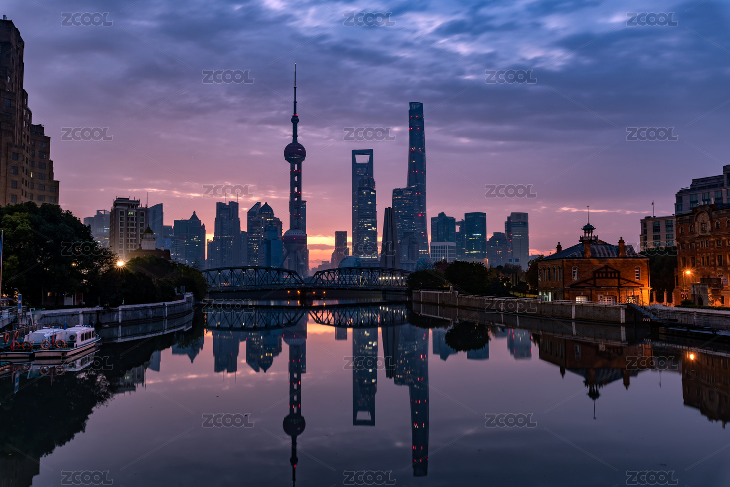 日落下的上海苏州河外白渡桥沿岸城市CBD