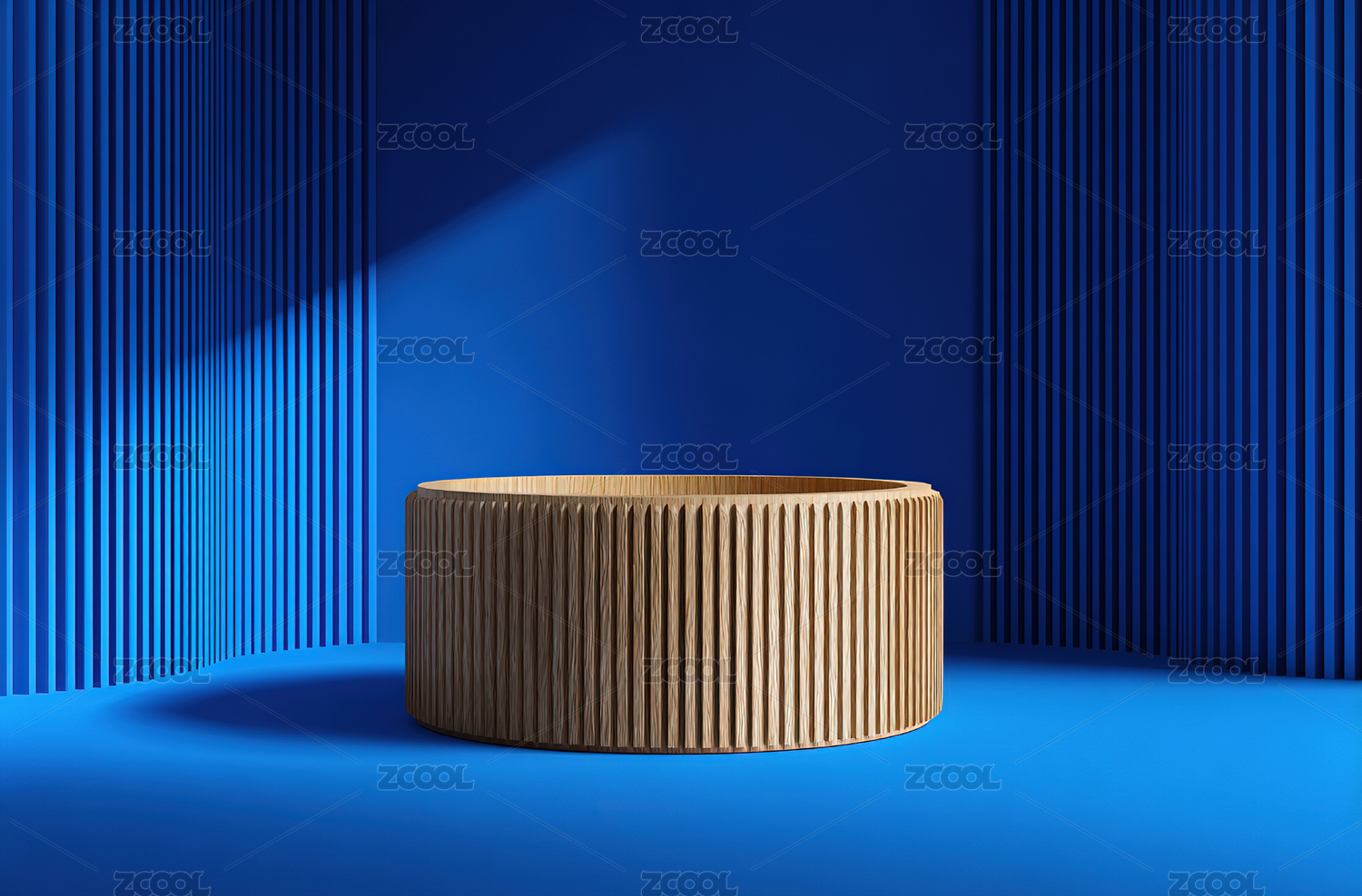 蓝色背景下的木质圆柱台