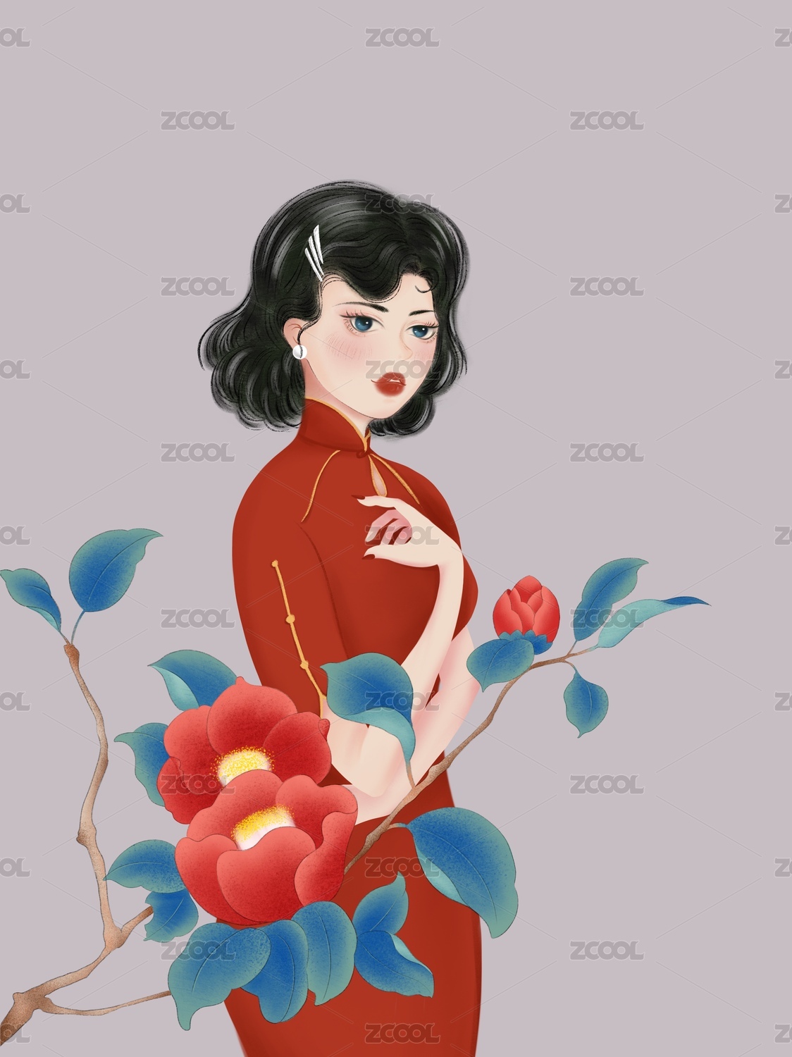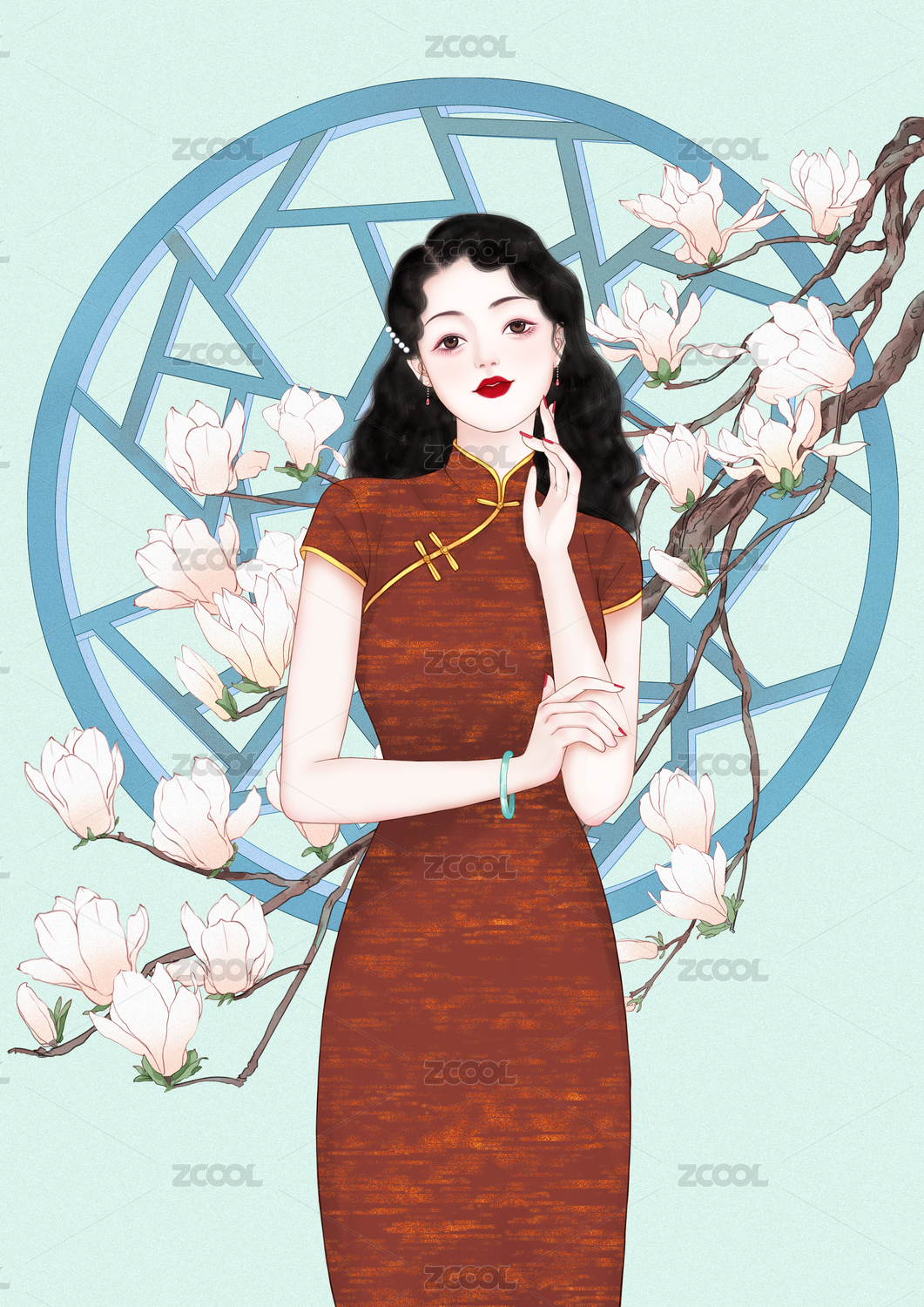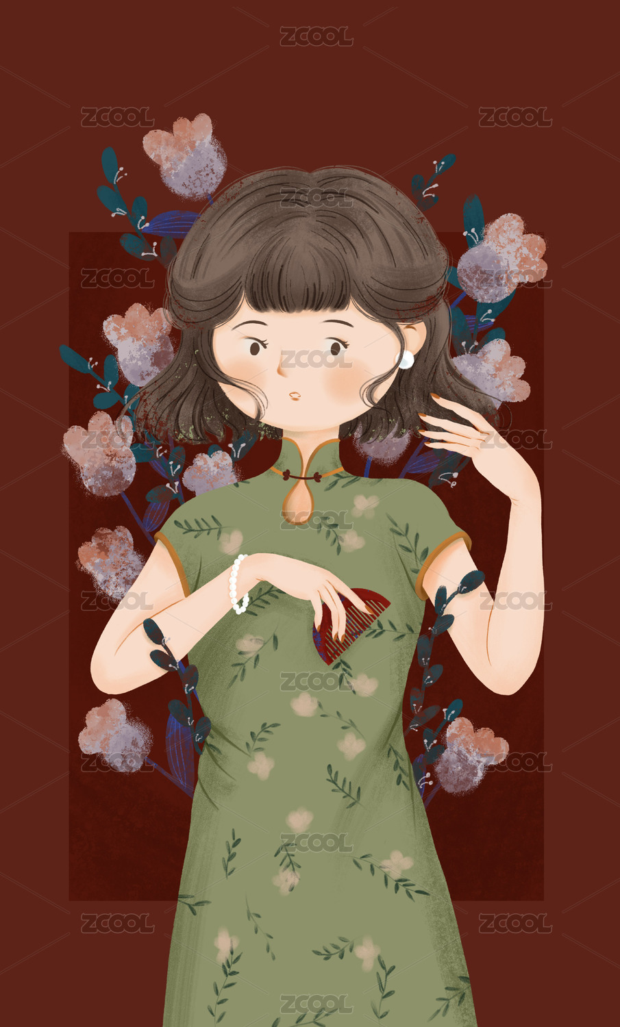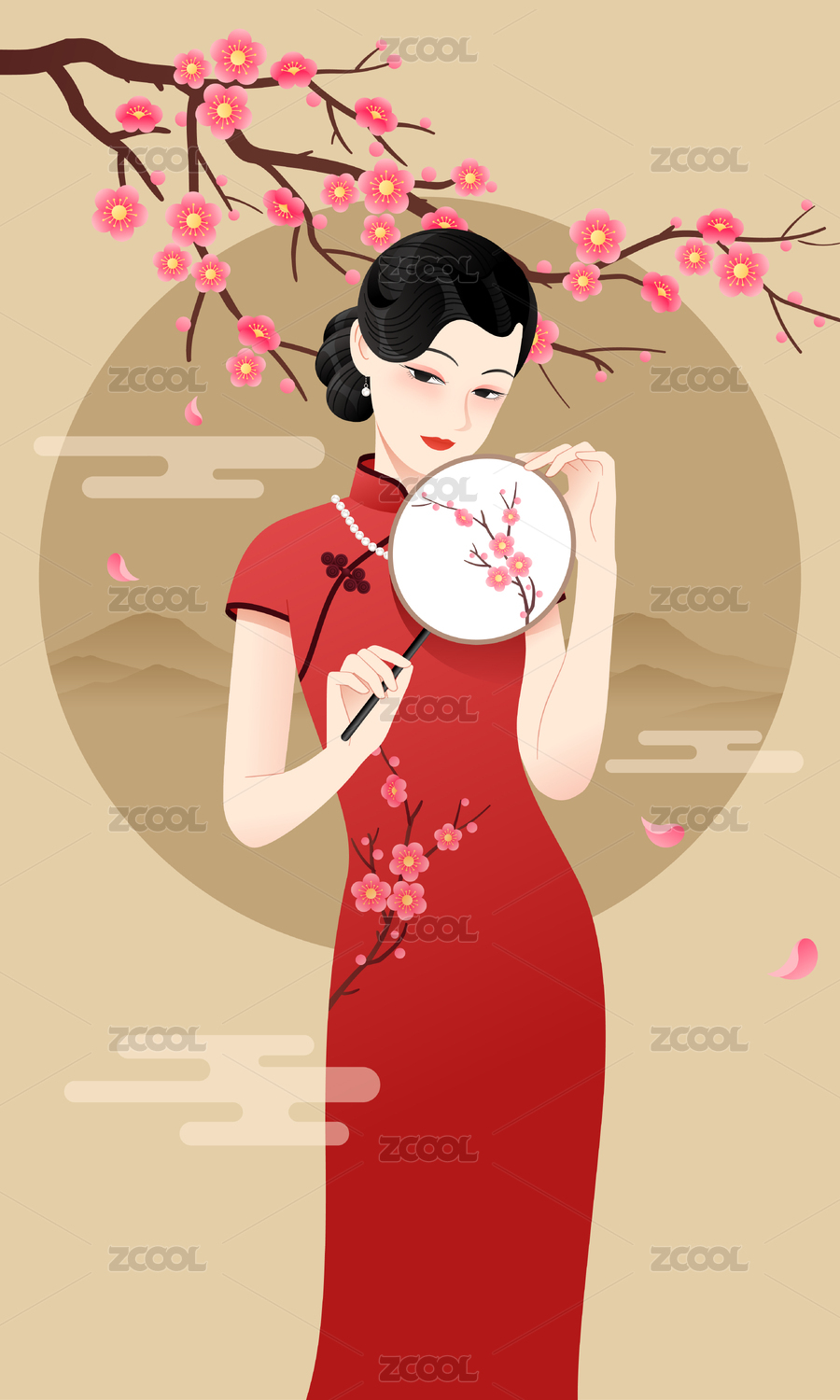新年,春节,过节,节日,传统,旗袍,扇子,祥云,鸟,金色