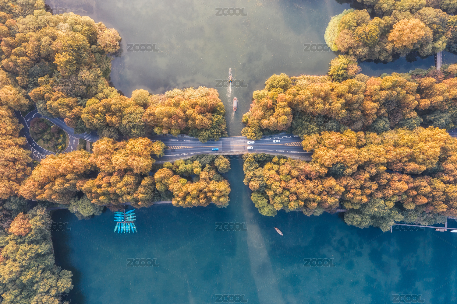 中国浙江杭州西湖杨公堤神州基地秋景航拍