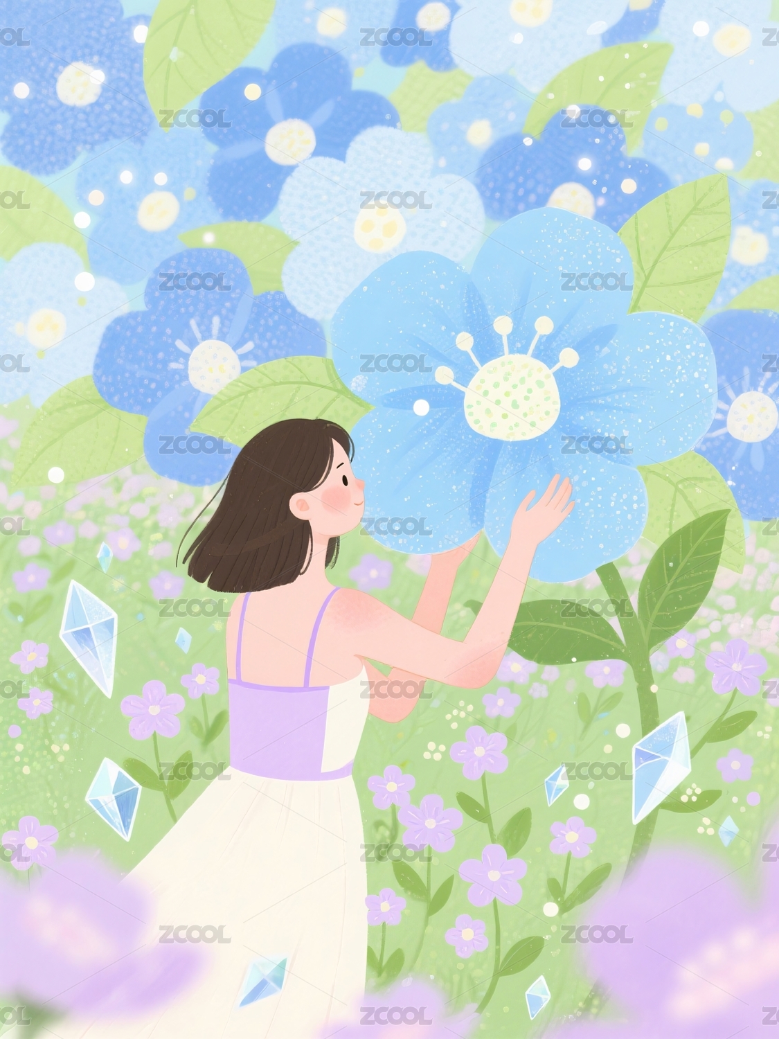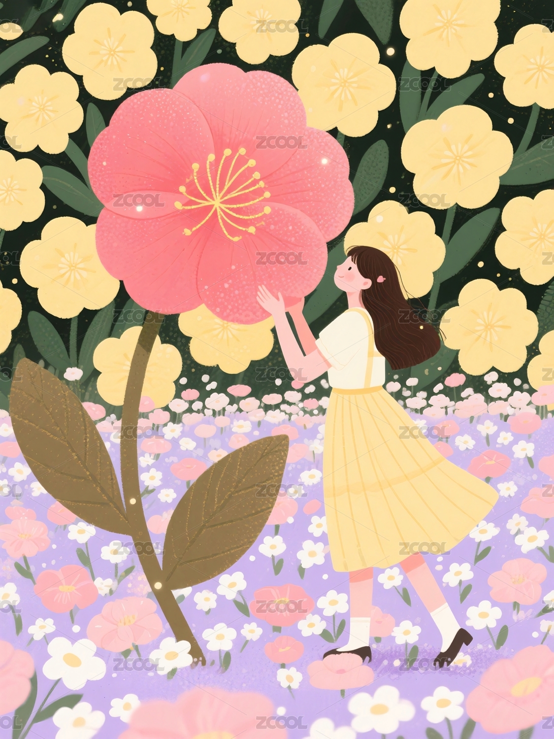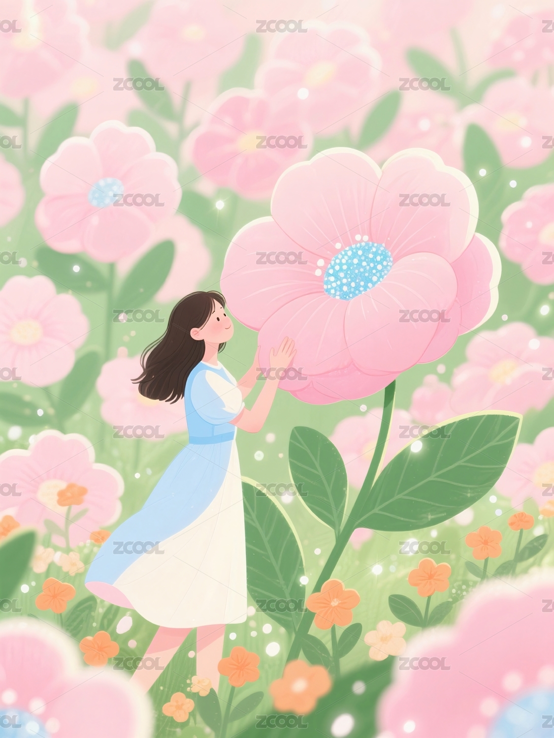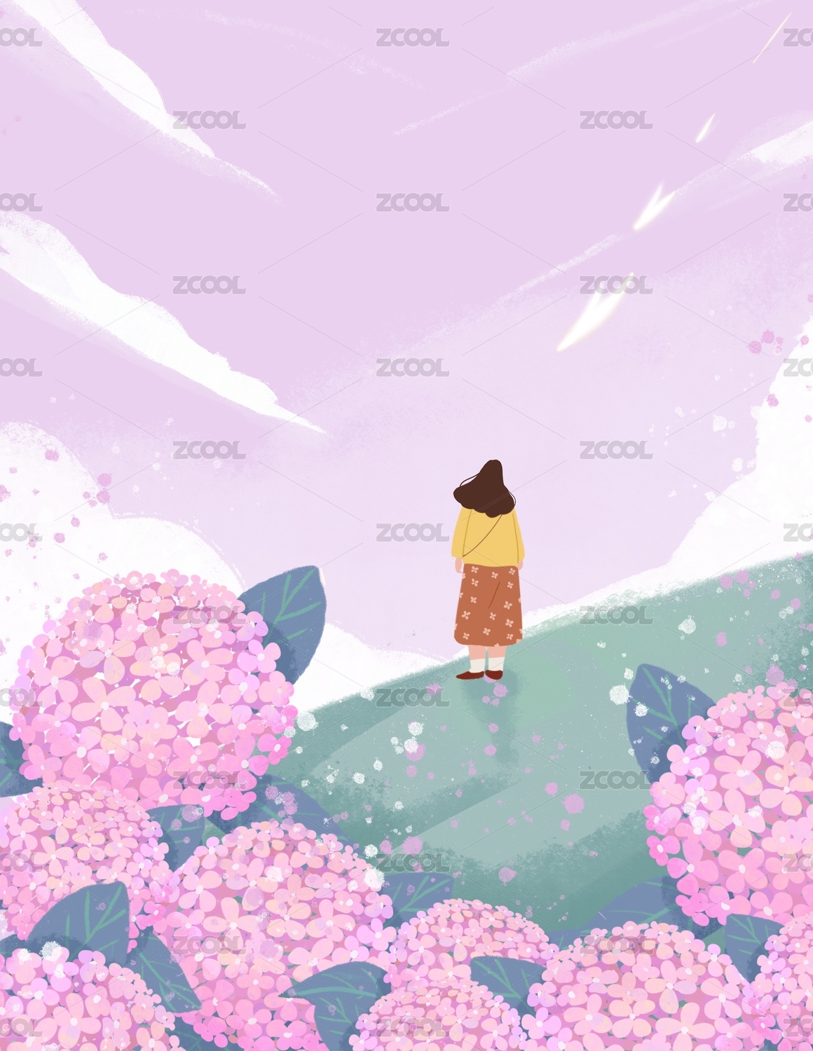 插画,女孩,花丛,月亮,粉色,幻想,唯美,期待,爱情,美好