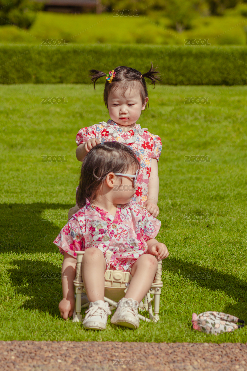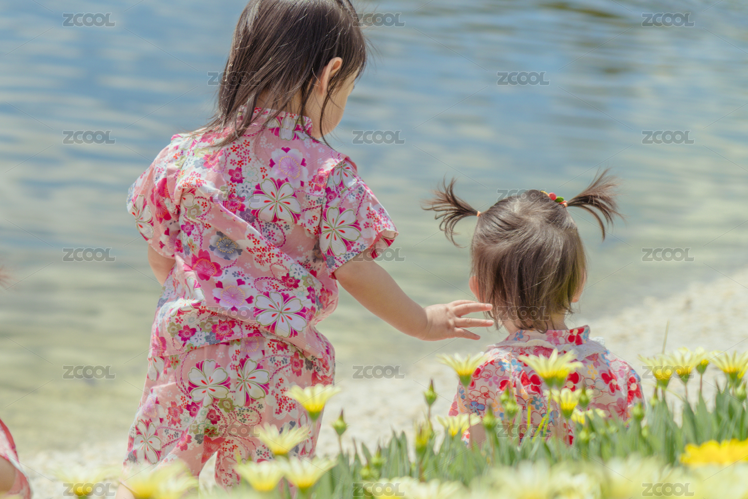 两个小女孩坐在湖畔花簇沙滩上看野鸭嬉水