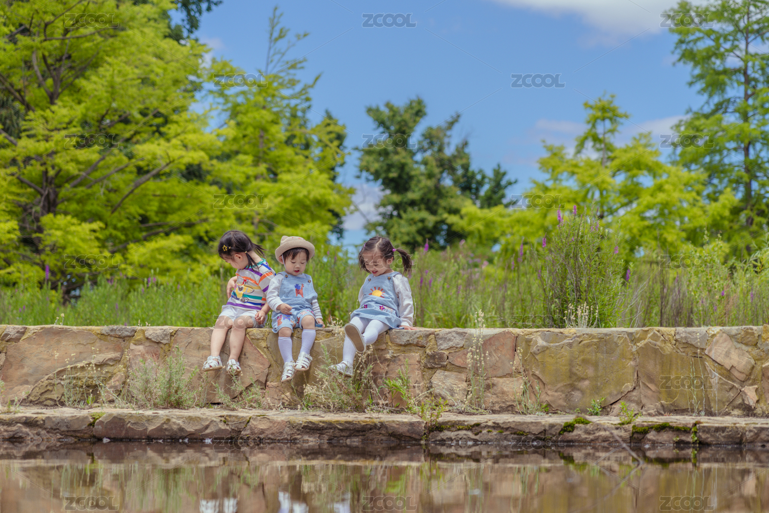 花样小孩坐在湖畔花簇沙滩上看野鸭嬉水