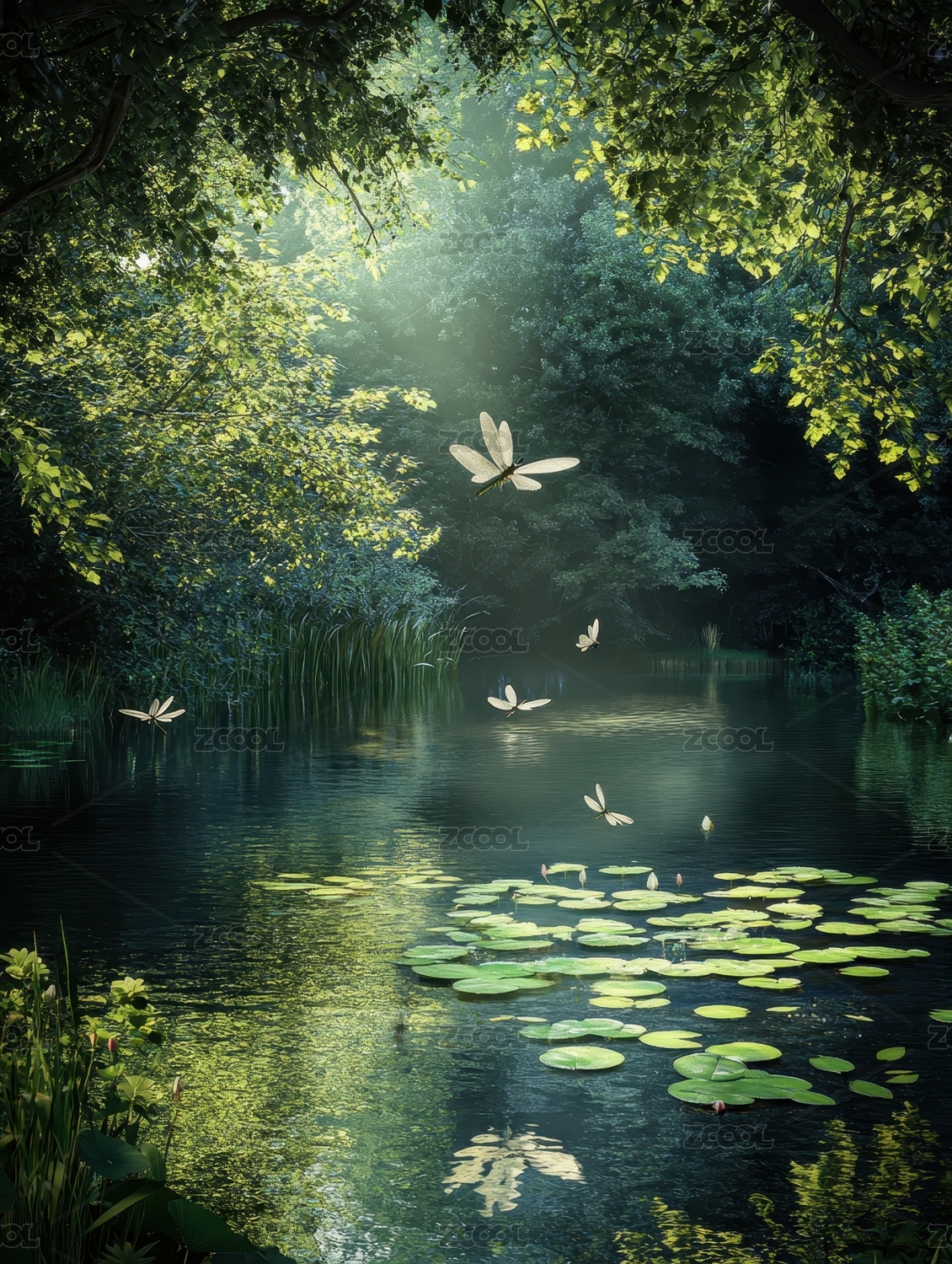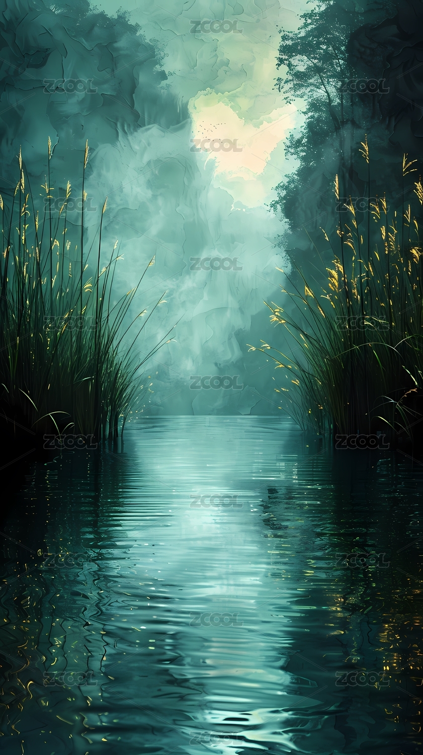 水,河,芦苇,绿色,蓝色,白色,极简主义,绘画,水彩画,插图