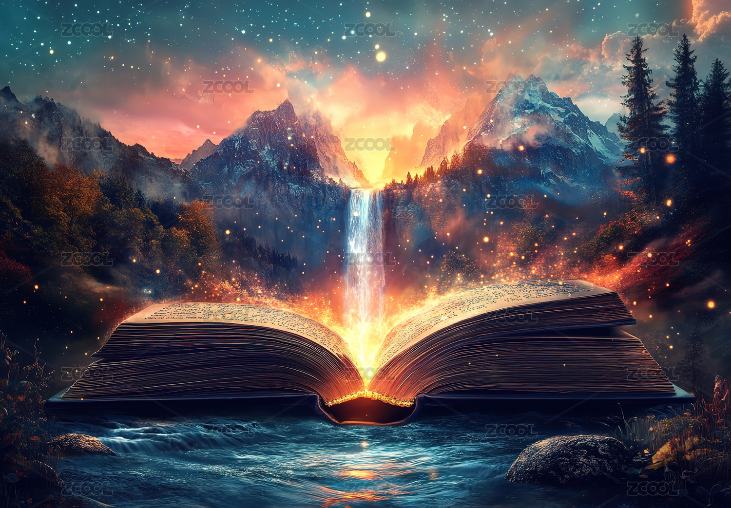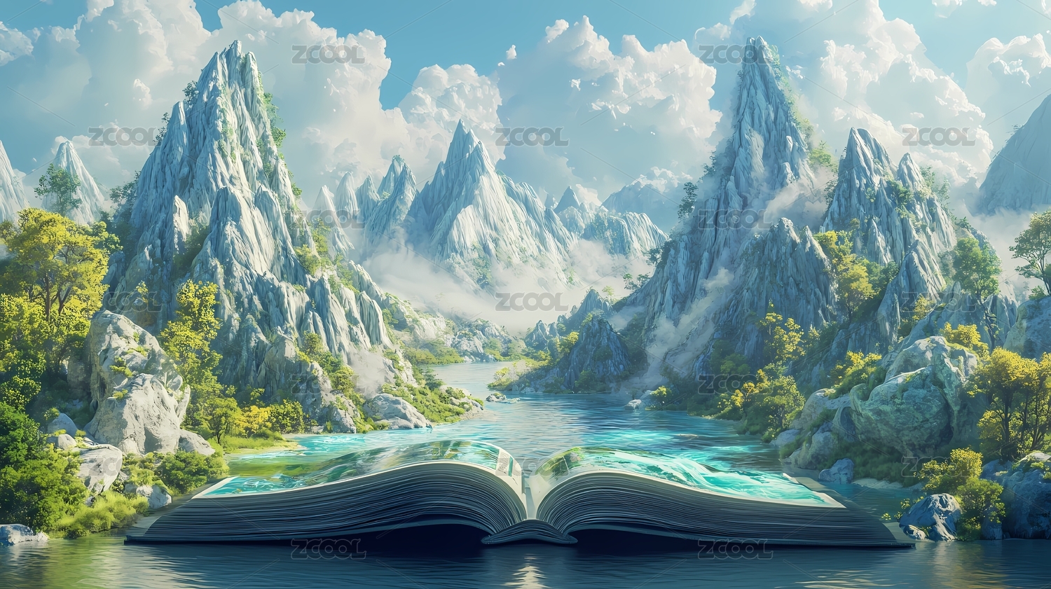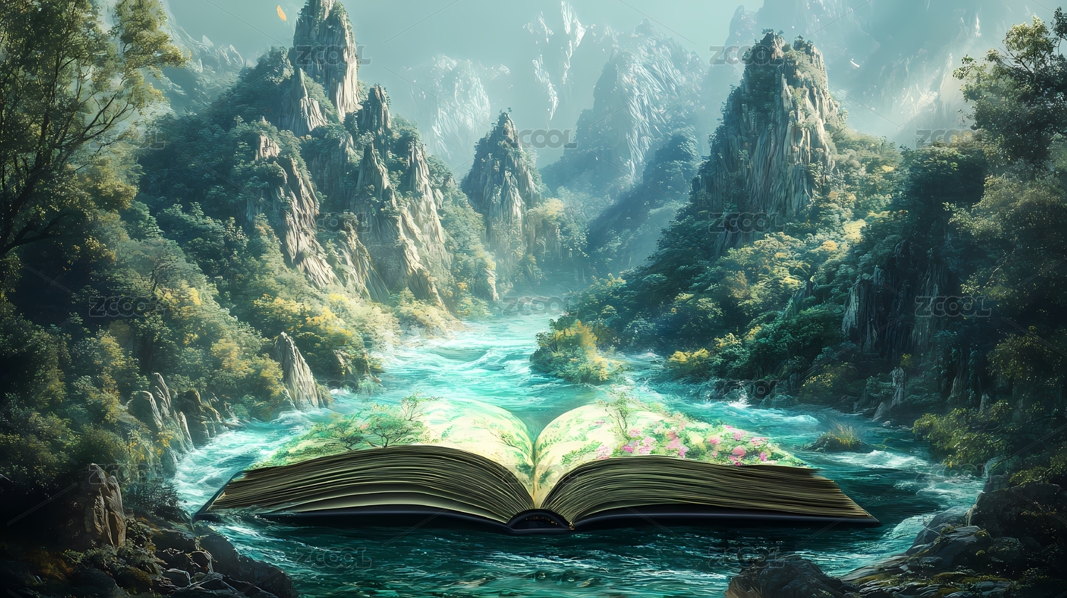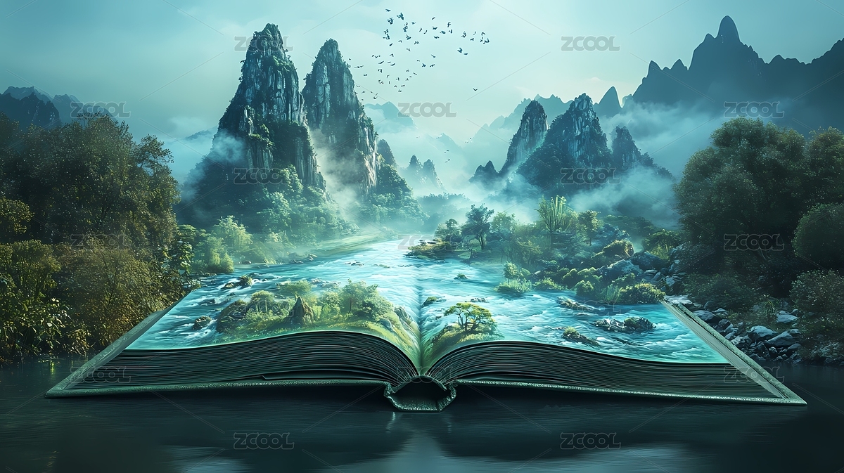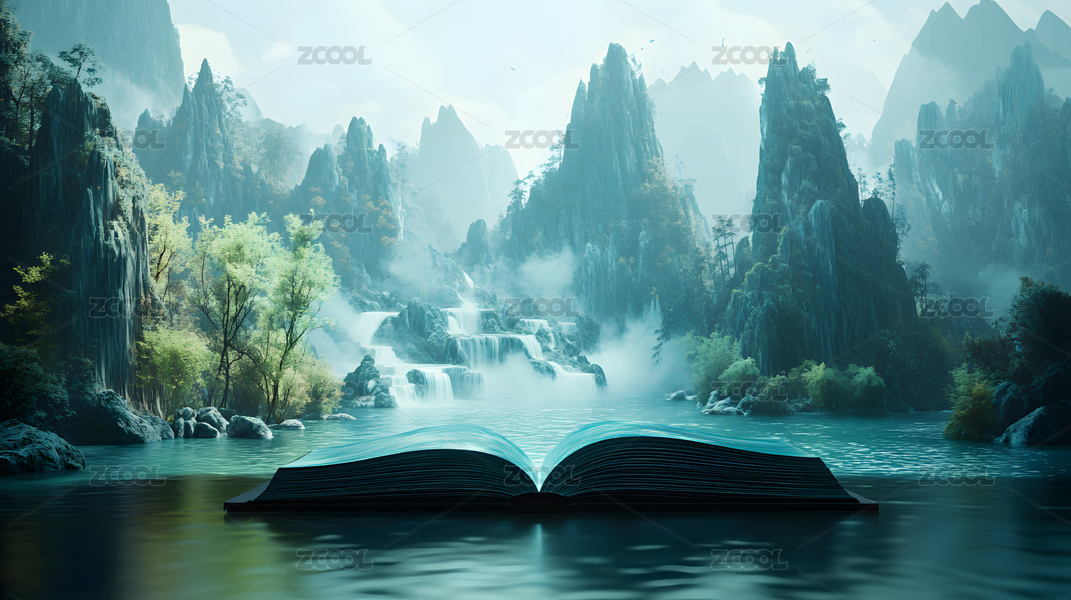 书,中国,禅宗,3d,绿色,白色,瀑布,河流,自然,风景