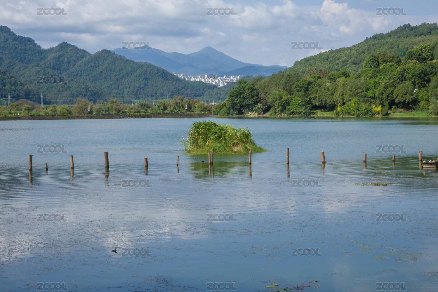 蓝天白云下的中国浙江宁波东钱湖湿地公园