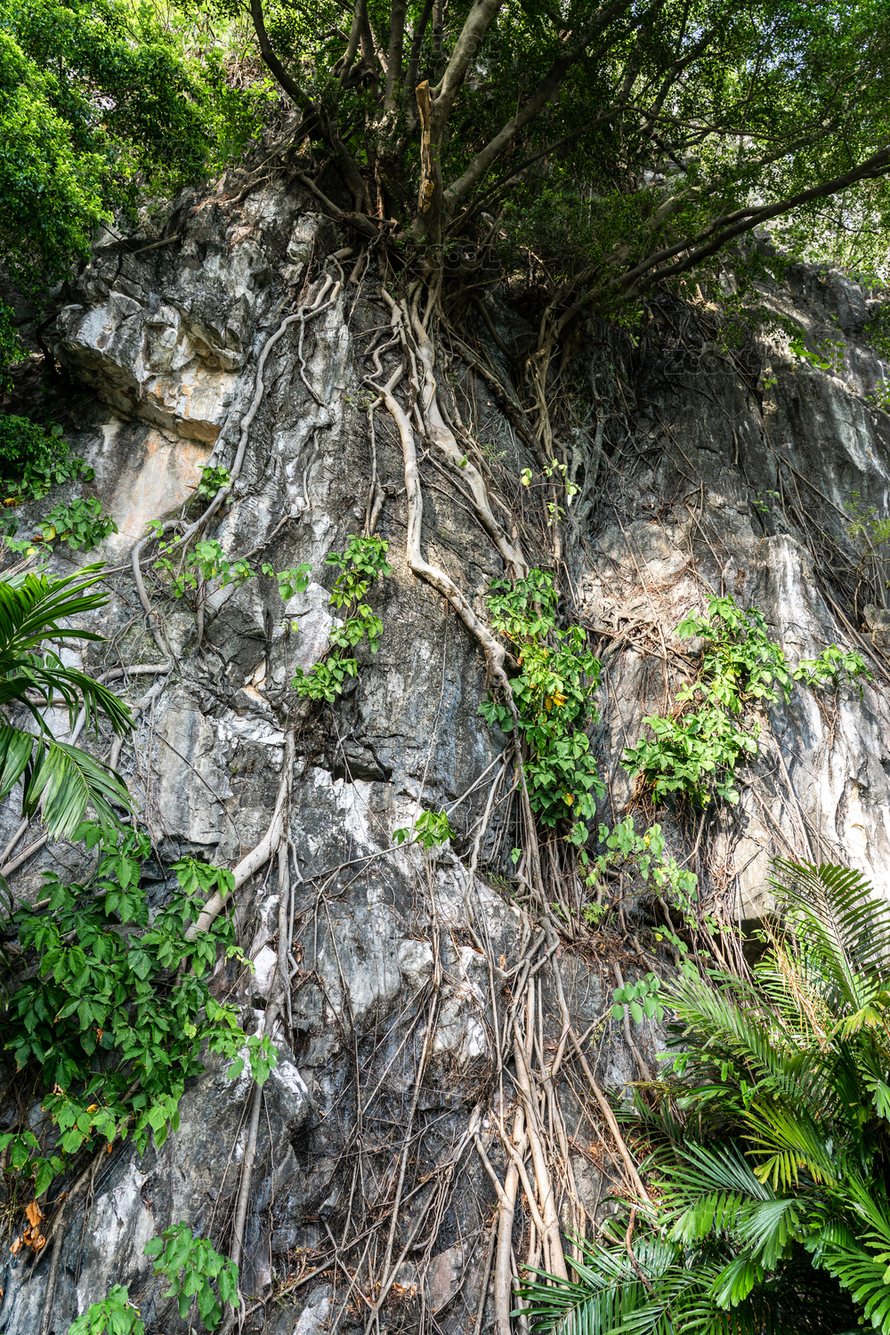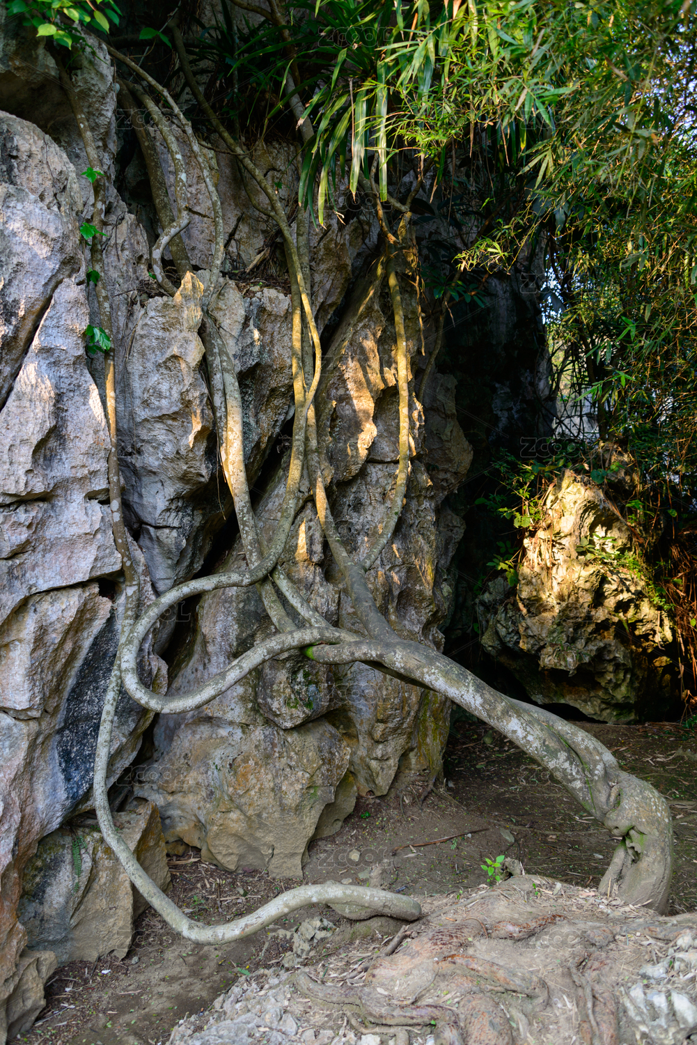 岩石上布满榕树根
