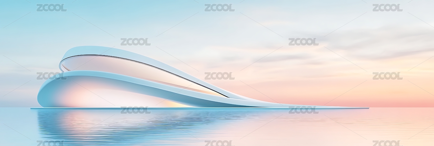 白色光滑地面与抽象的扭曲建筑有天空背景
