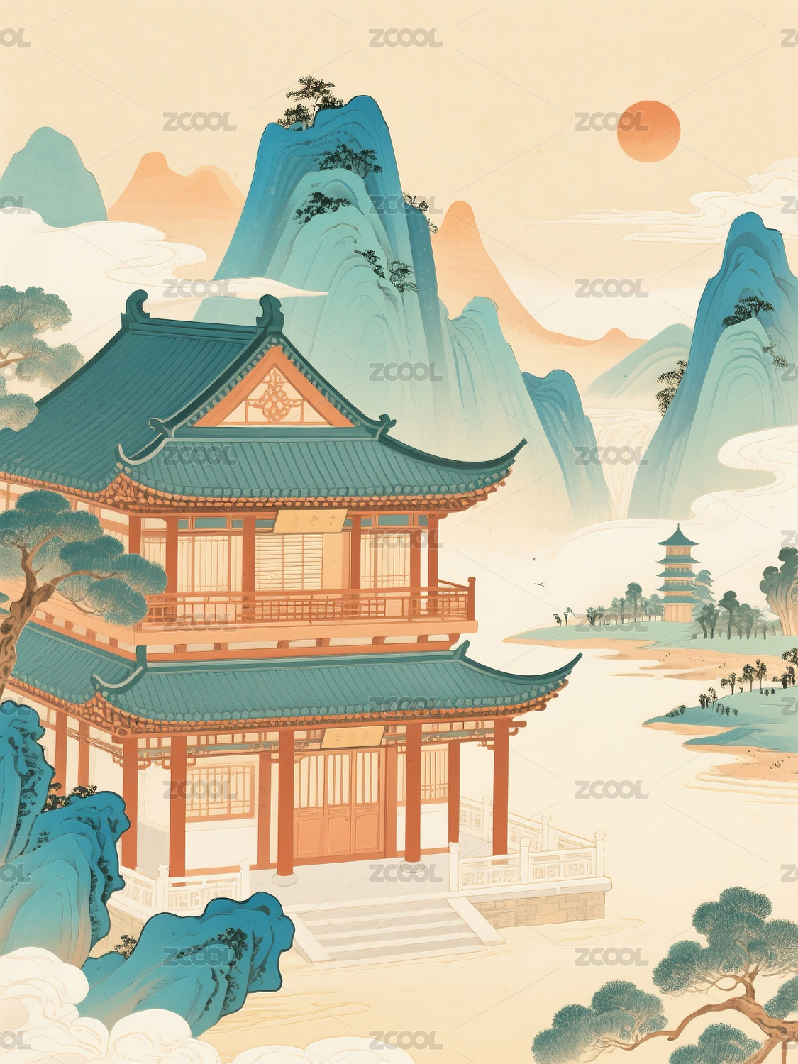 颜色鲜明的工笔画风格中式建筑国风山水插画