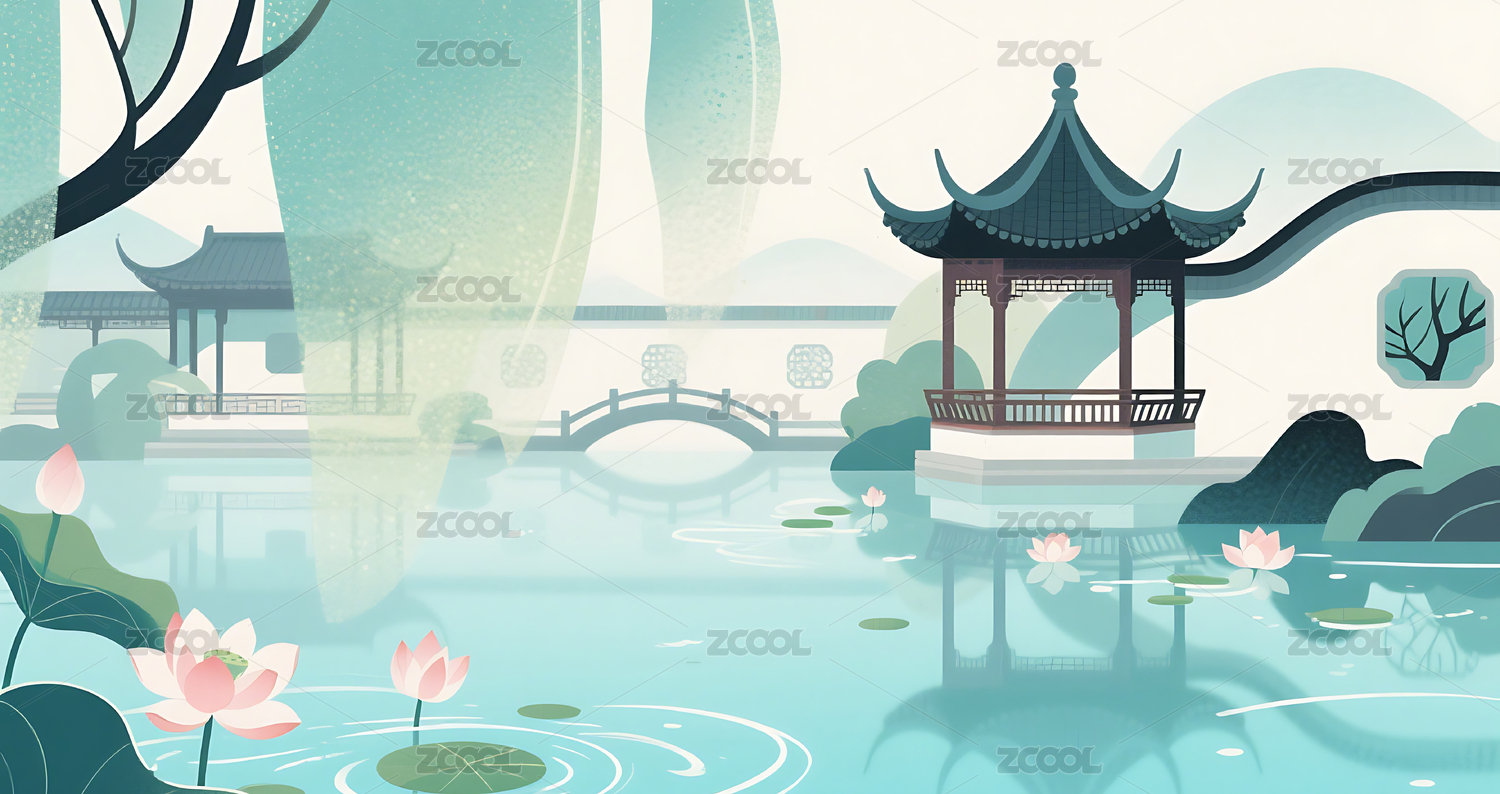 AIGC2024,中国风,中式园林,凉亭,国风插画