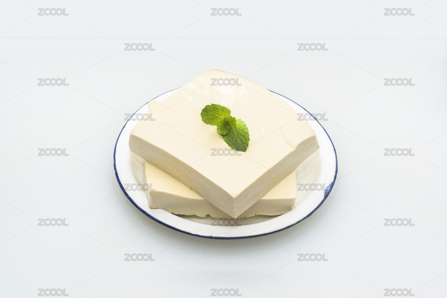 两块豆腐盛在盘子里,绿色薄荷叶点缀,放在白色背景上