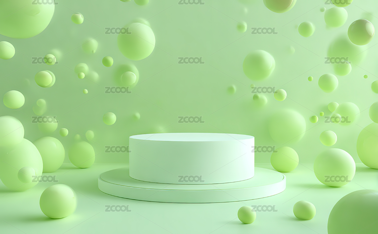 绿色背景下的圆柱形展示台与悬浮气泡