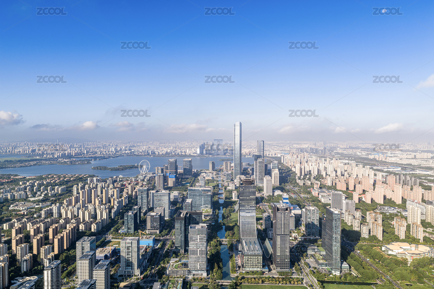 航拍傍晚的苏州金鸡湖湖东城市风光