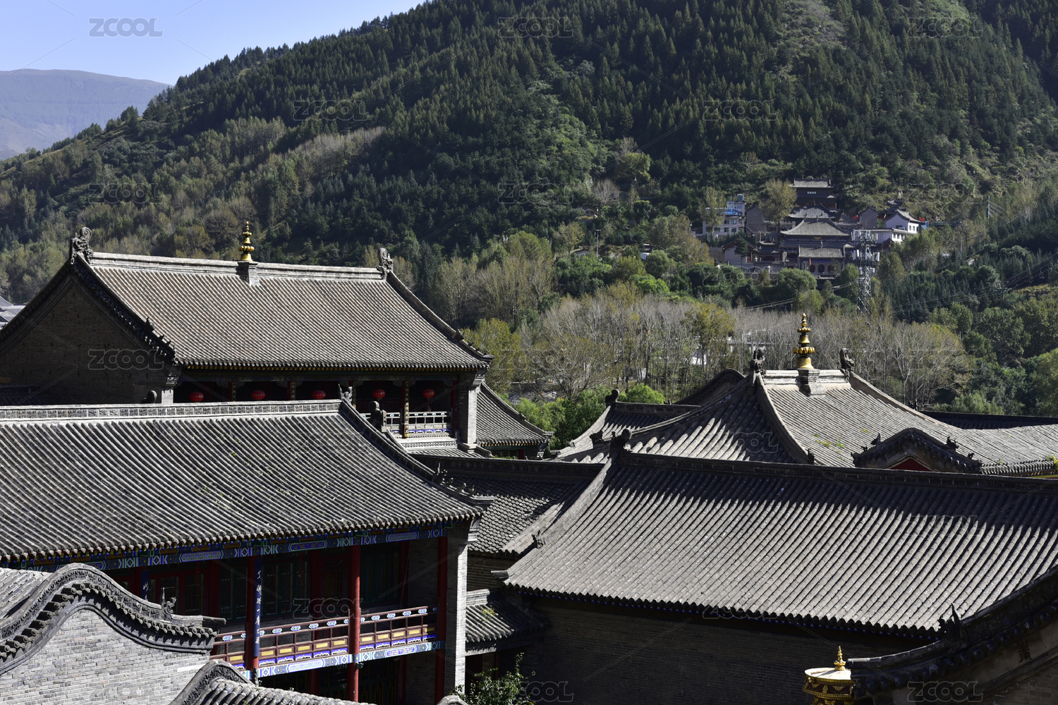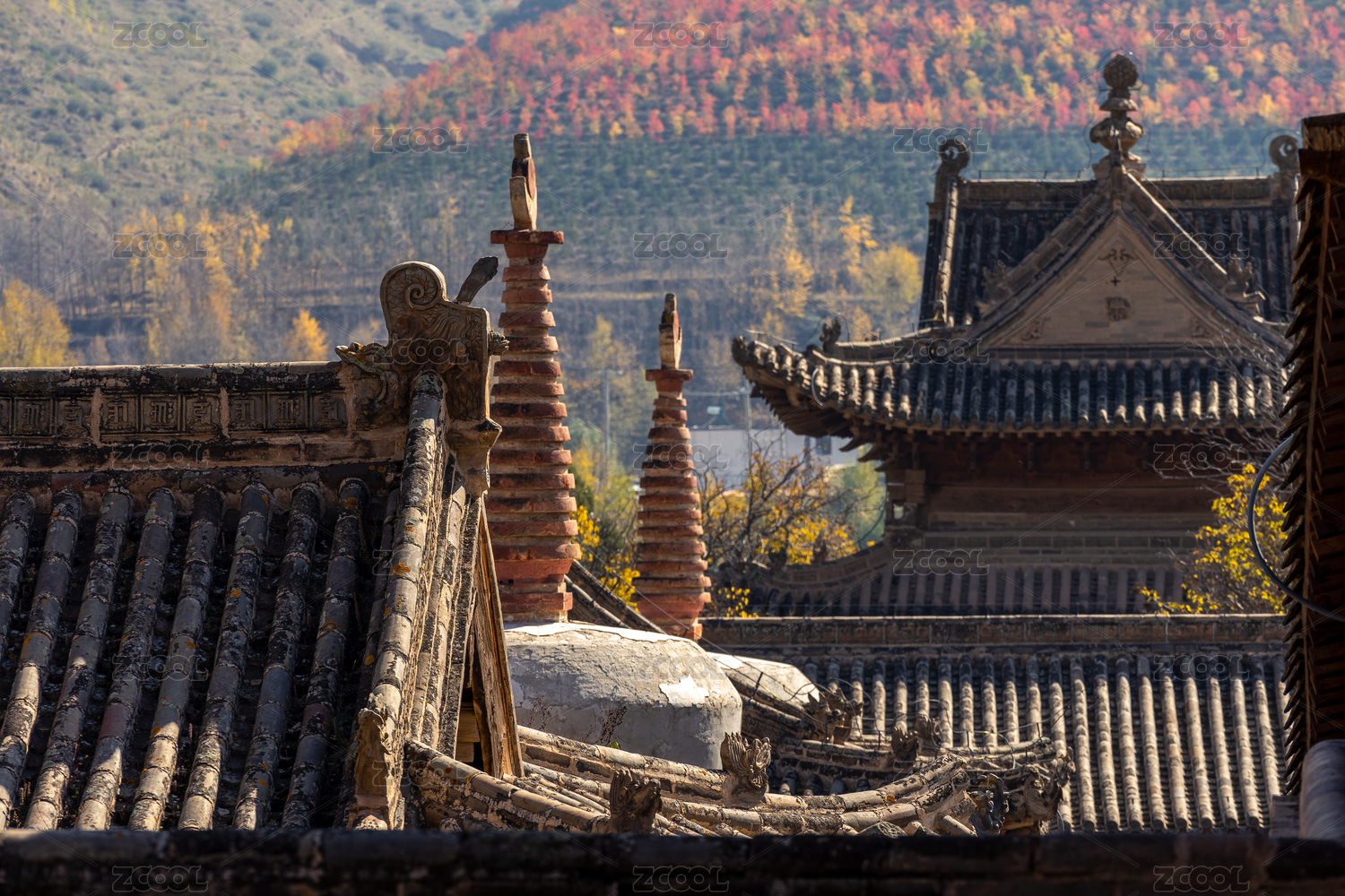 中国山西省五台山南山寺大雄宝殿白塔俯拍