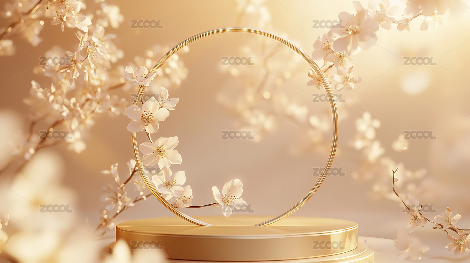 樱花环绕的金色圆环展示台