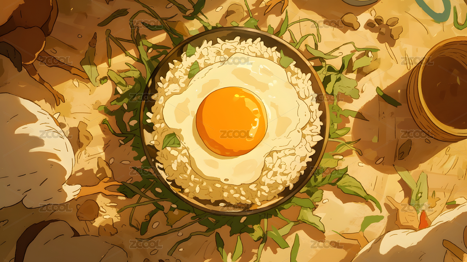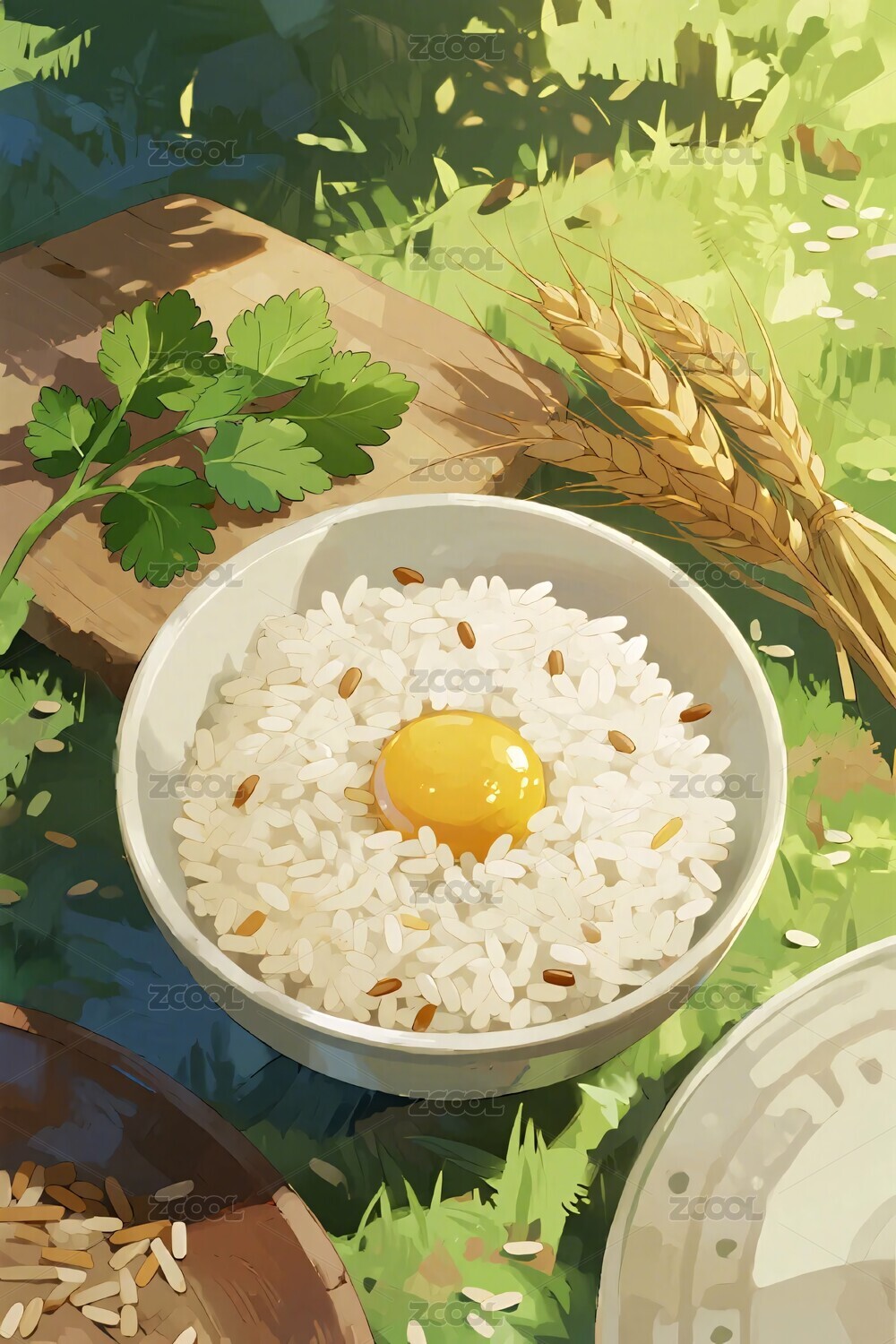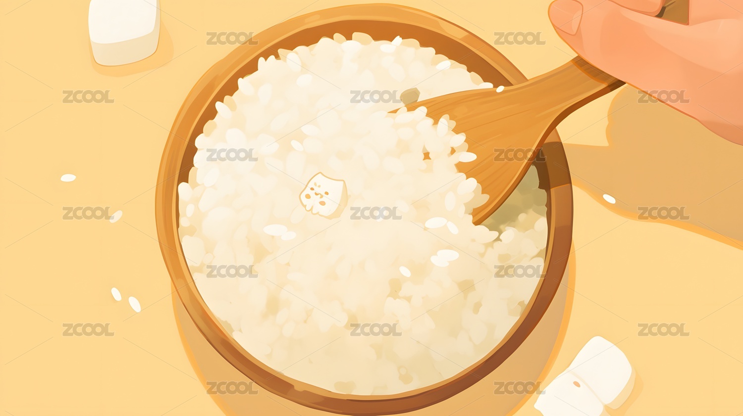 桌上吃剩的一碗大米饭和洒出的米粒插画绘画