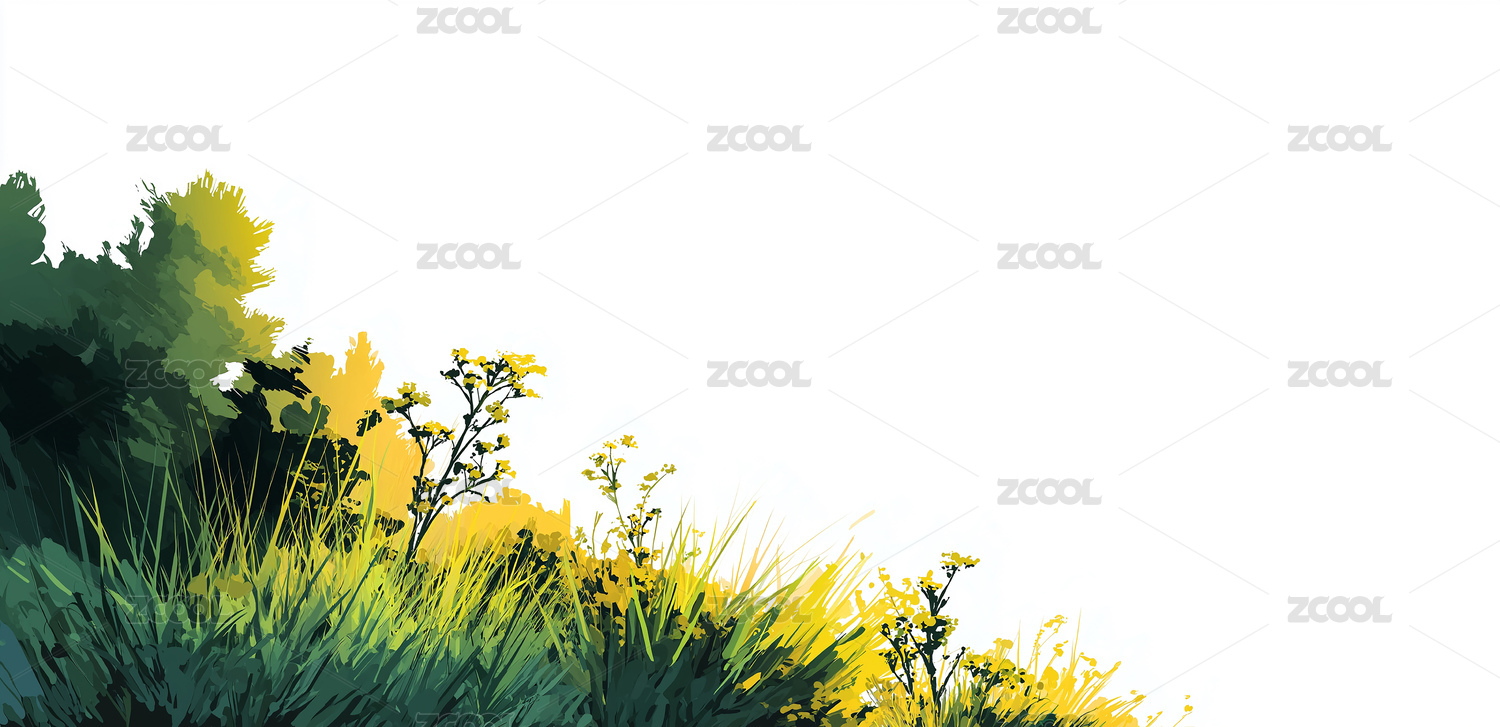 白色背景下黄绿草甸与小花展现清新治愈的自
