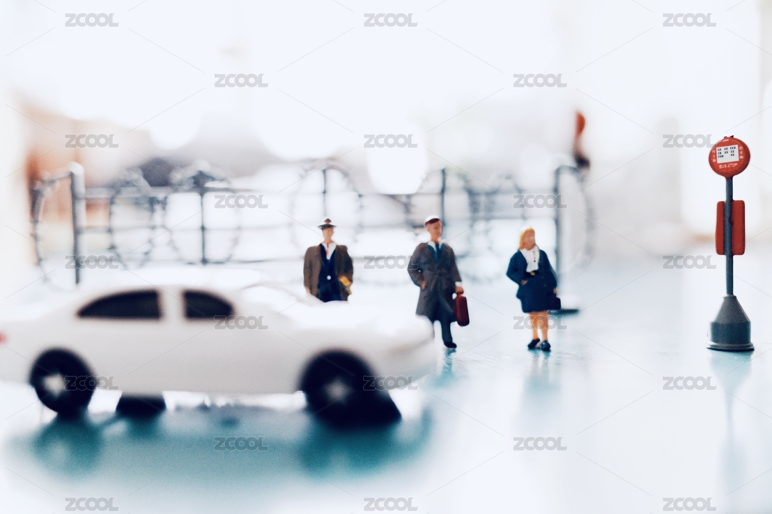 蓝色背景上的车模和小人偶喜欢逛车展的人