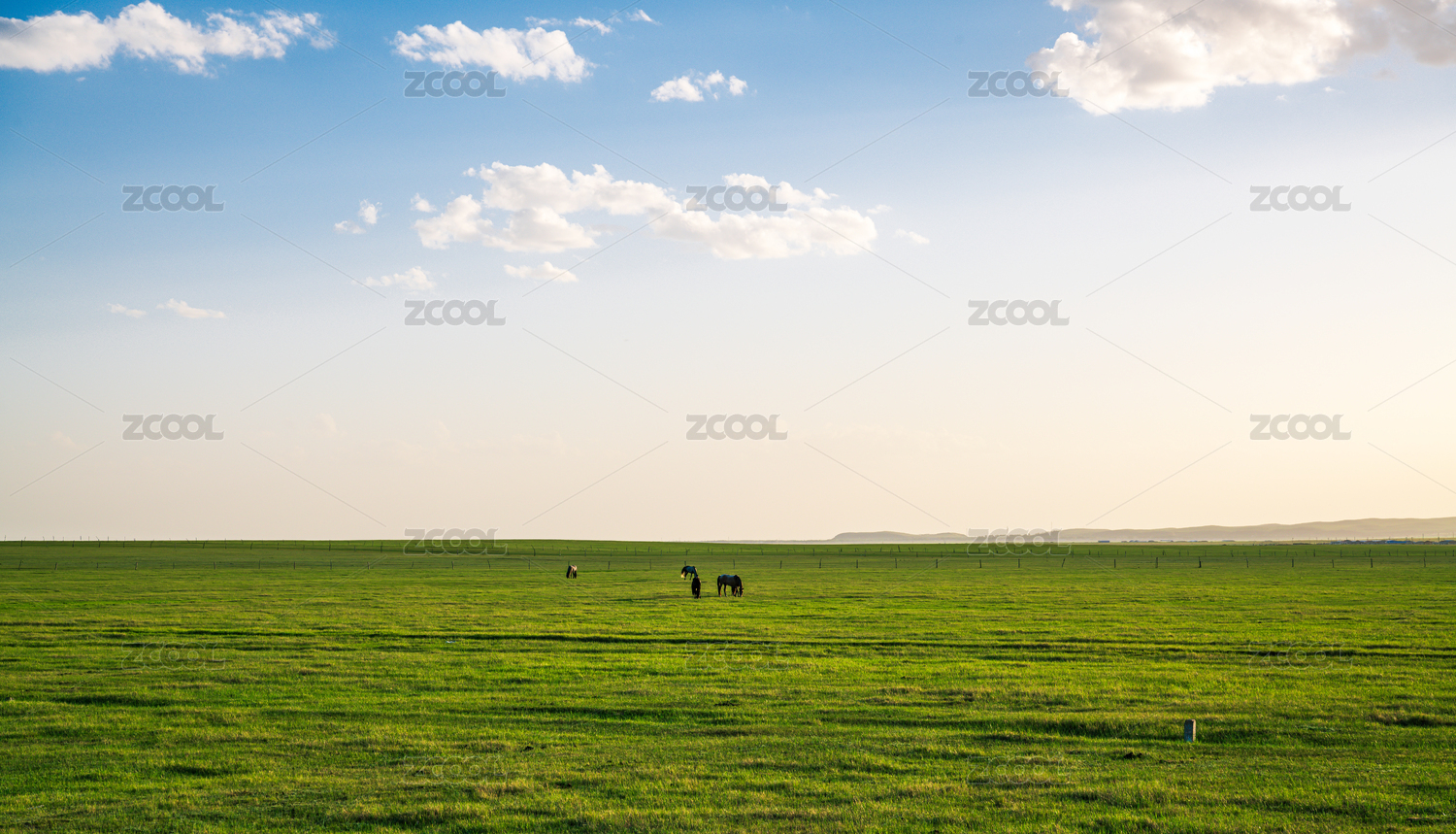 河北省沽源县库伦淖尔景区清晨的草原牧马