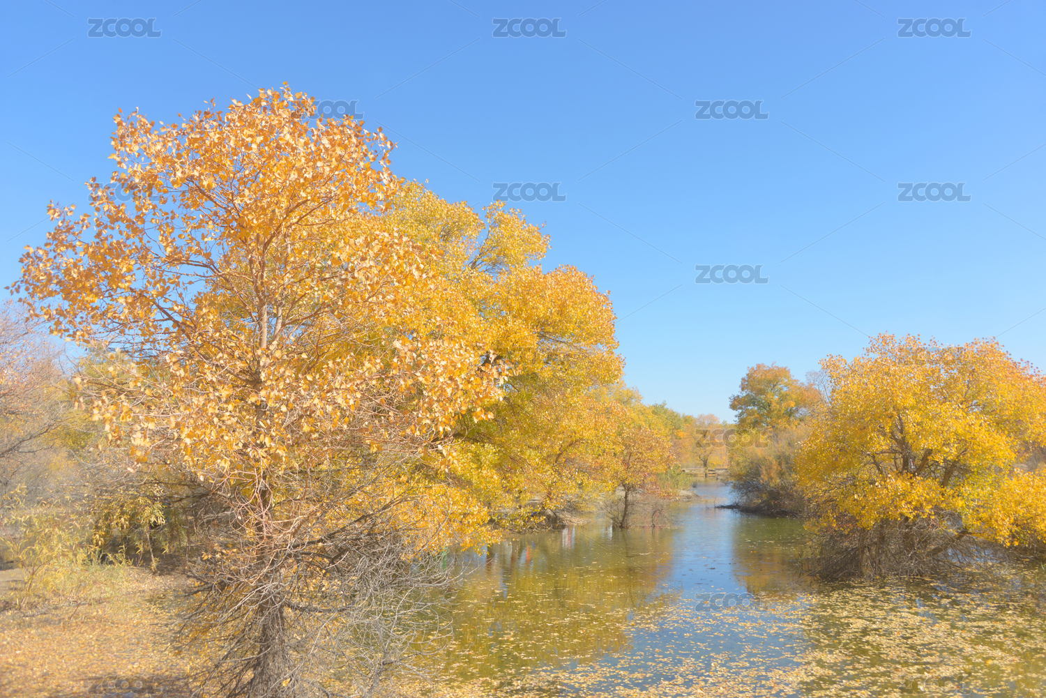 中国甘肃金塔胡杨林金波湖湖面秋天落叶