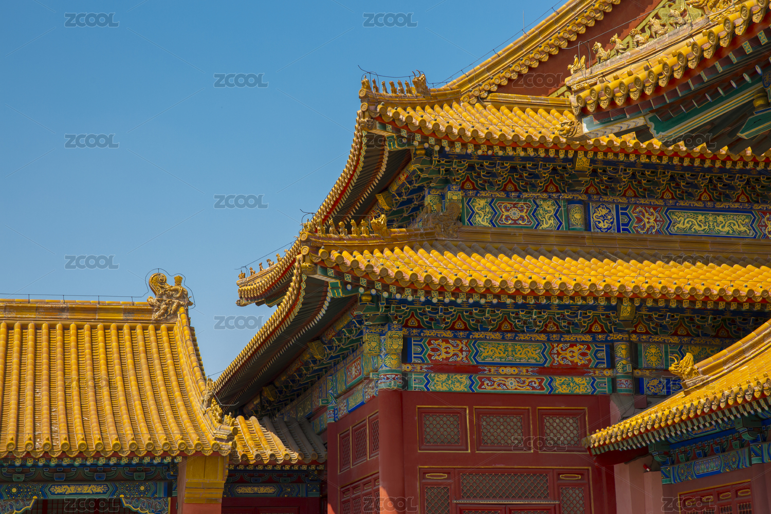 晴朗的蓝天下中国北京故宫博物院宫殿屋檐特写