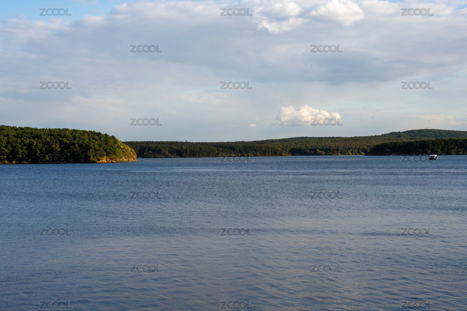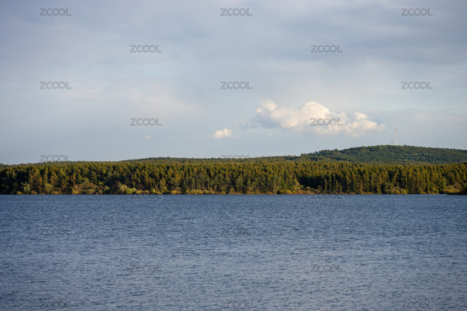 吉林长春净月潭宁静的湖泊与远处的森林景观