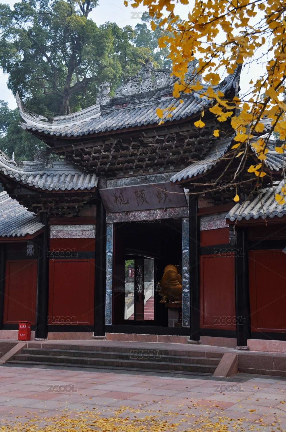 中国四川省成都市文殊院秋季金黄色银杏树下的寺庙古建筑