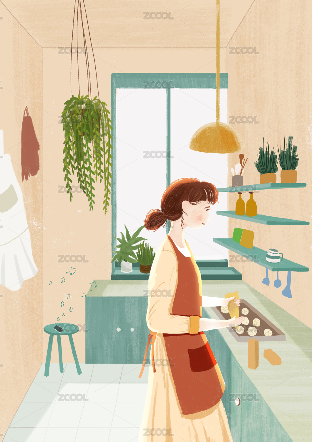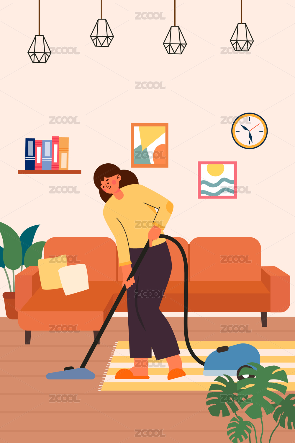 用吸尘器打扫卫生的居家劳动女人矢量插画
