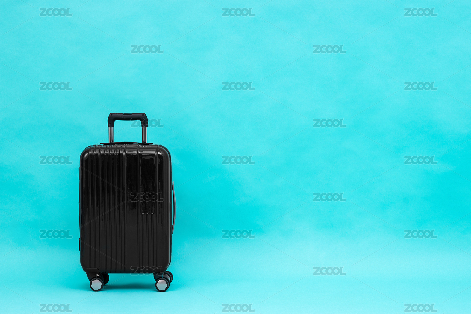 摆放在青色背景前的黑色拉杆旅行箱