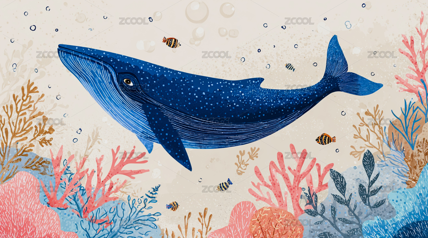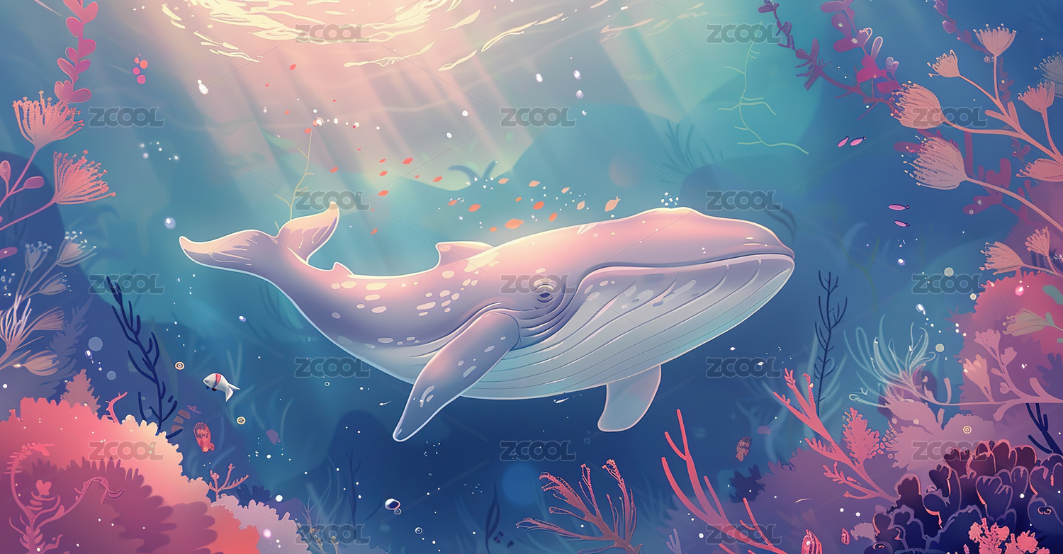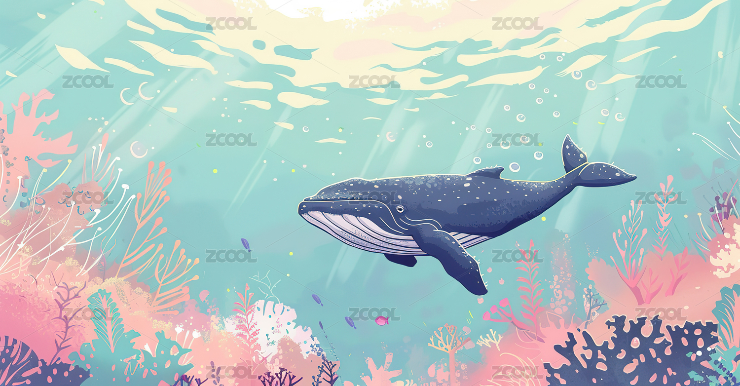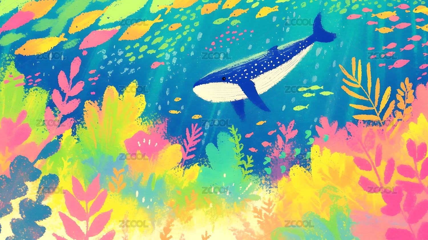 鲸鱼在充满珊瑚和各种小鱼的海洋中畅游