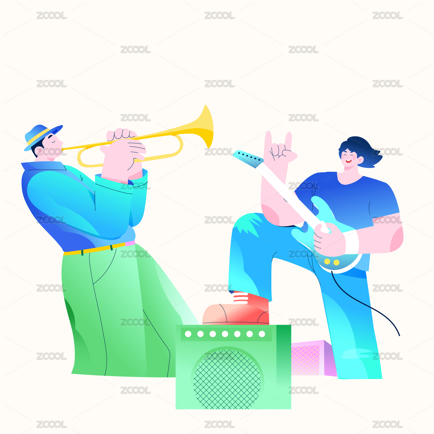 两个人开心快乐的弹奏乐器演唱音乐插画