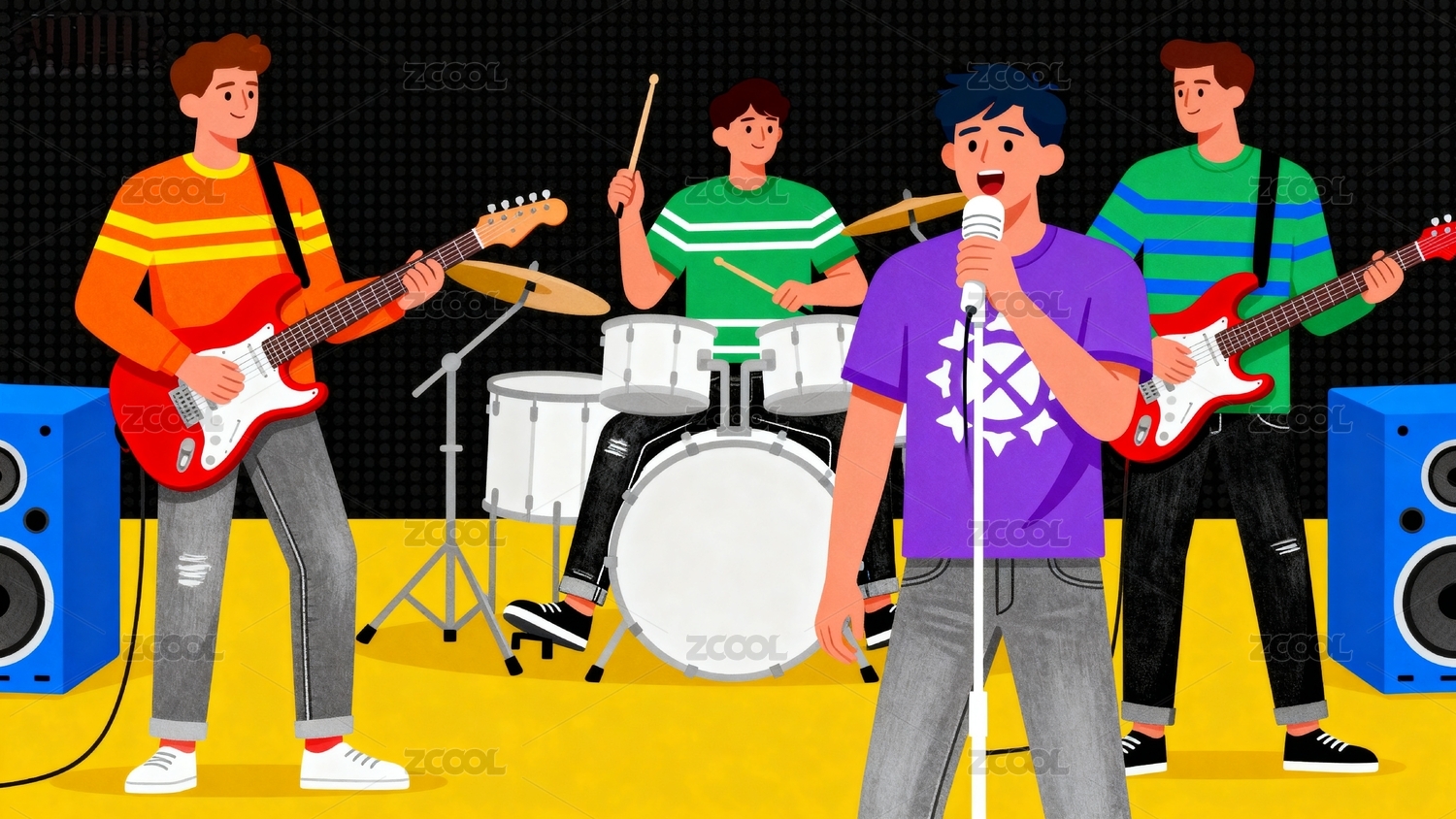 一群青年在草地弹奏音乐唱歌跳舞插画