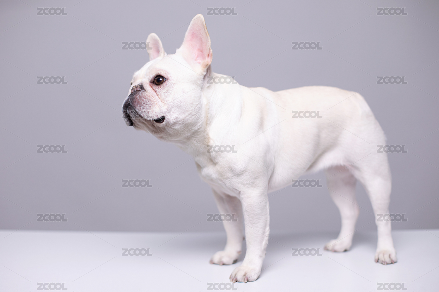 一只抬着头伸着舌头的奶白色法国斗牛犬站在白色背景前拍宠物写真