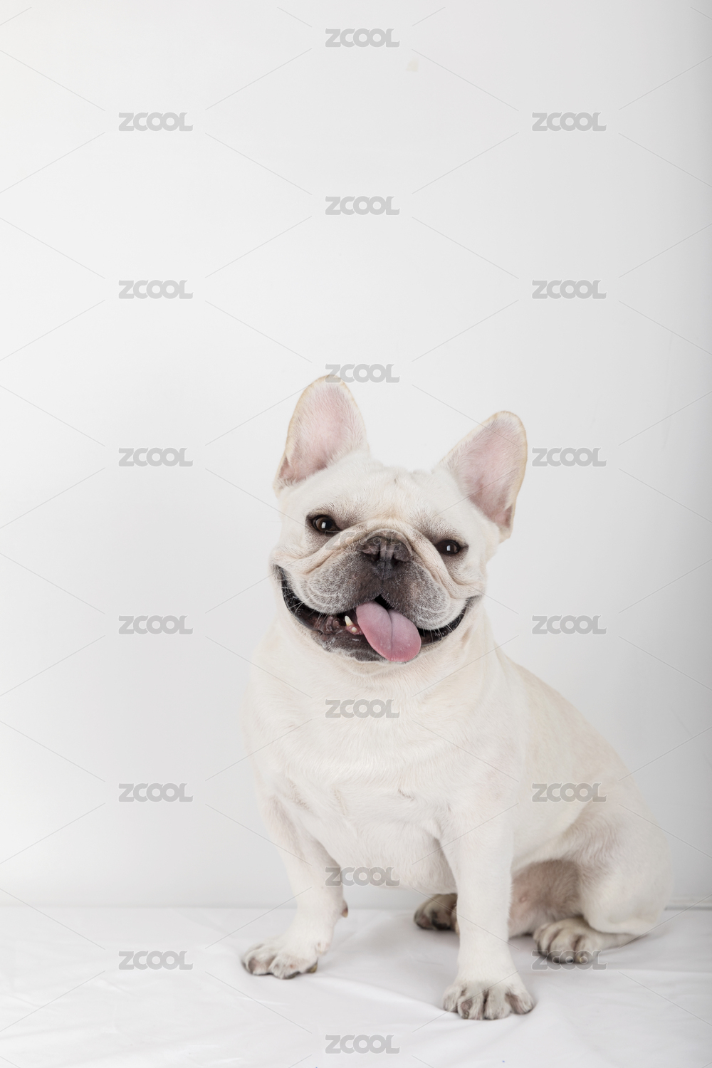 一只歪着头伸着舌头的奶白色法国斗牛犬坐在白色背景前拍宠物写真