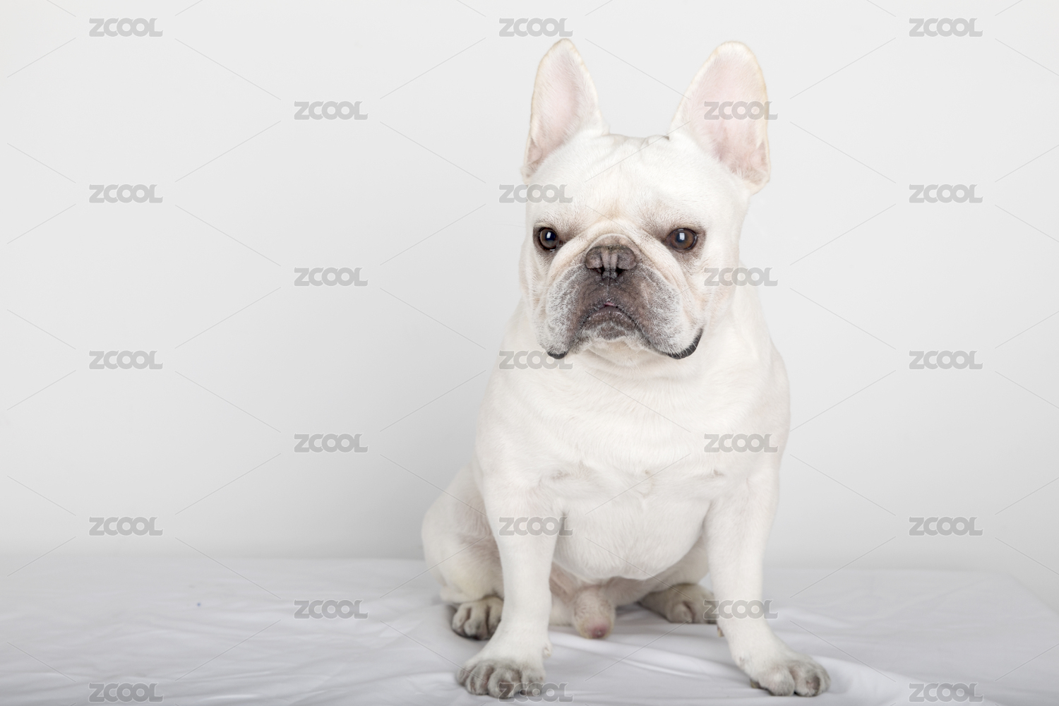 一只底着头不开心的奶白色法国斗牛犬坐在白色背景前拍宠物写真
