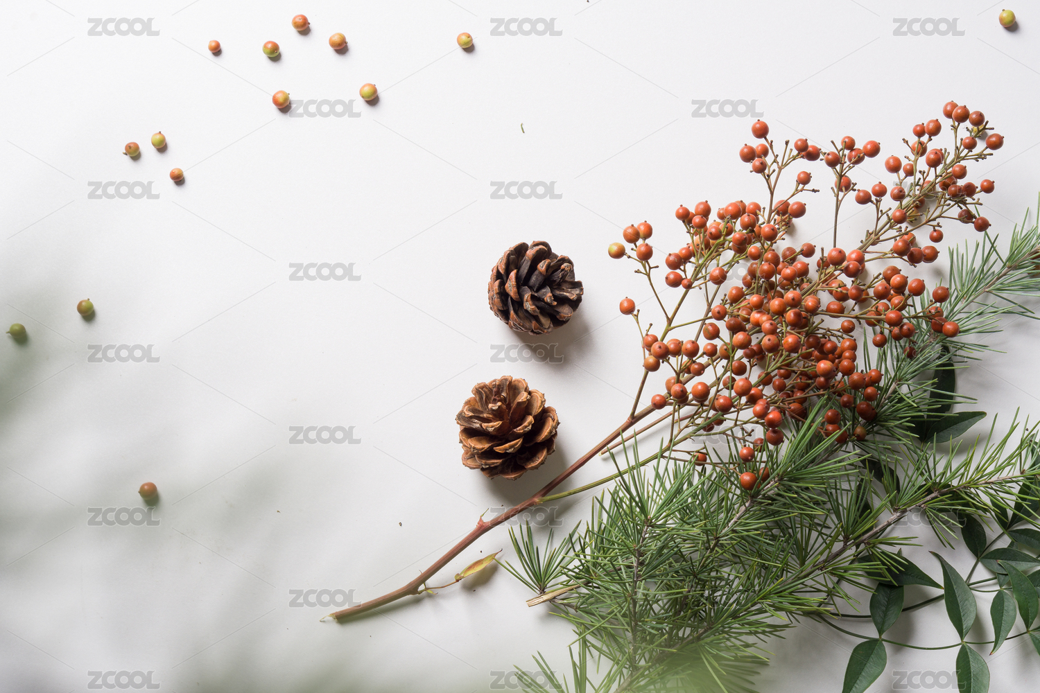 白色背景中的红果松果松枝