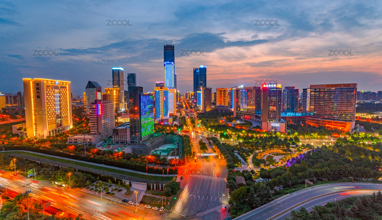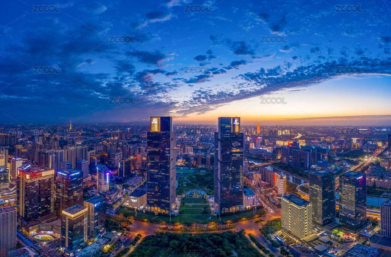 航拍郑州绿地双子塔夜景城市天际线都市地标