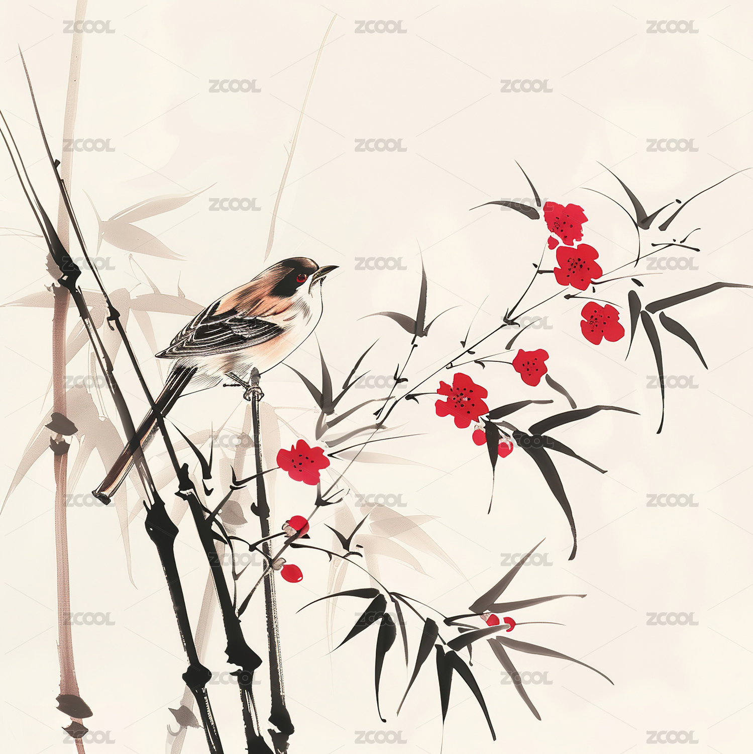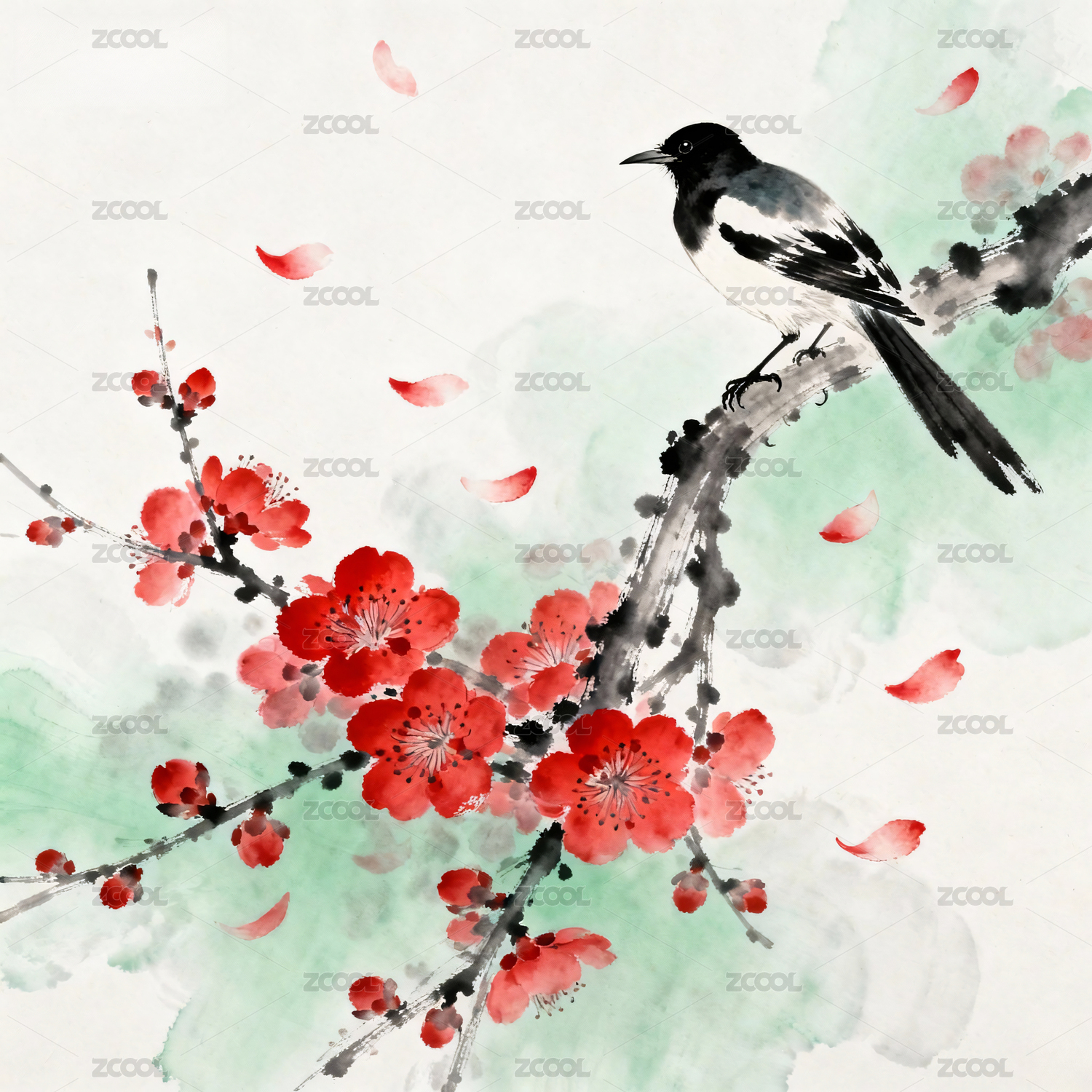 水墨画,中国画,鸟,梅花,枝条,花朵,红色,黑色,白色,艺术