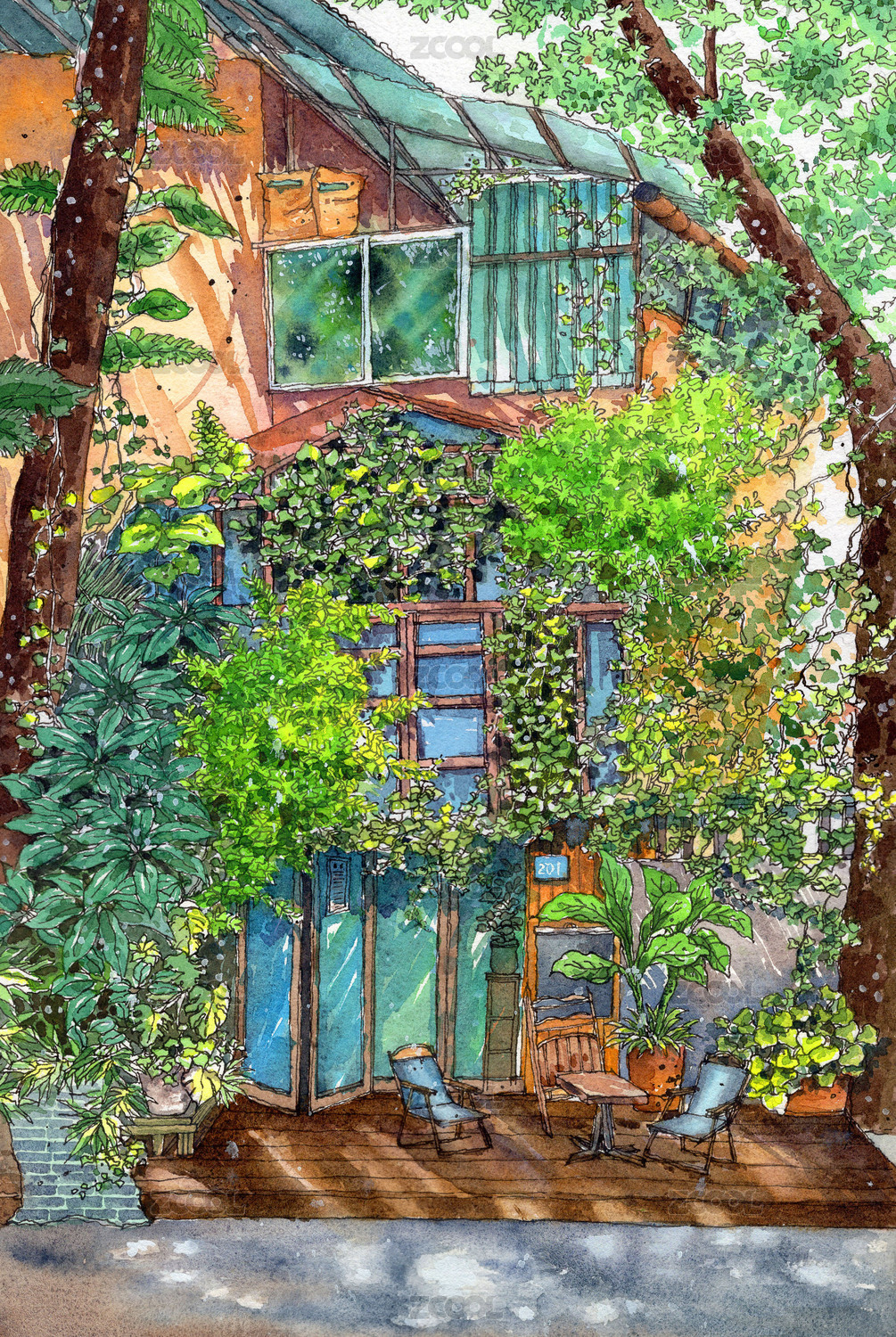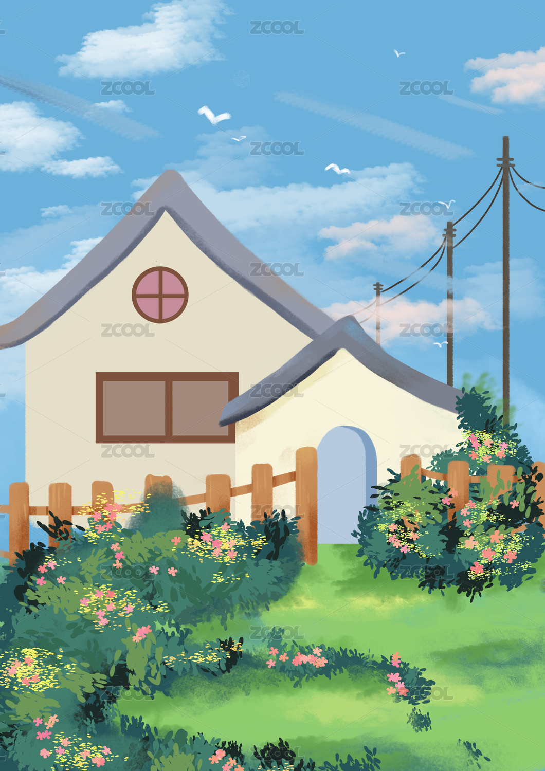 欧洲建筑白墙红顶的小屋河对岸是花海