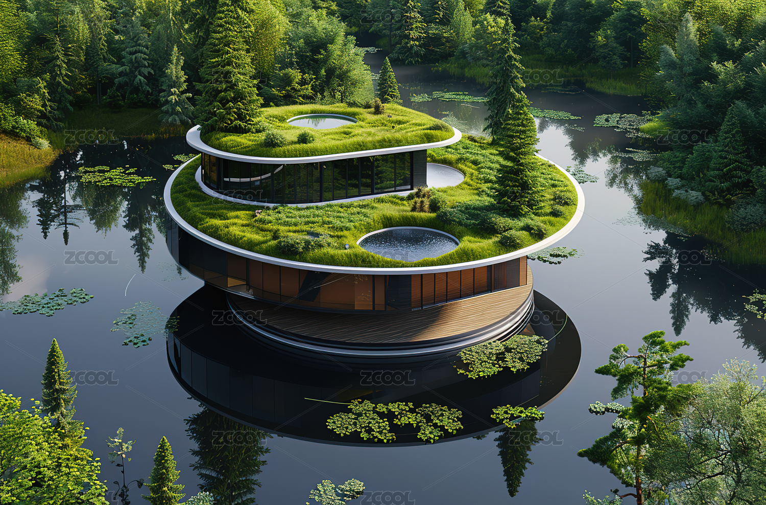 被郁郁葱葱的绿色植物包围的未来派玻璃屋