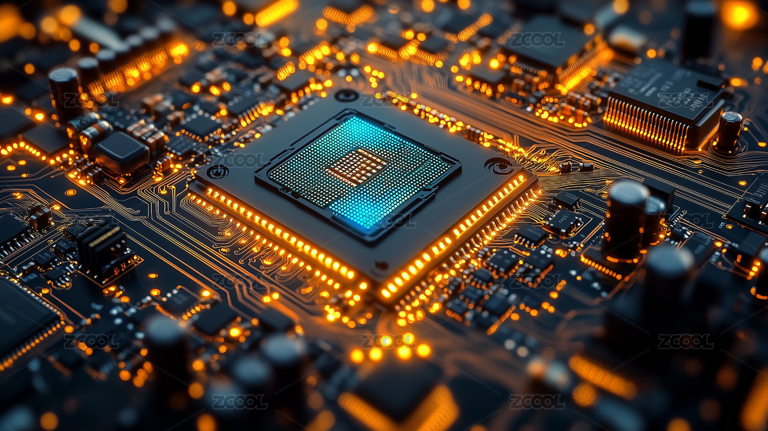 高科技电路板芯片,蓝色与橙色光芒交错闪耀