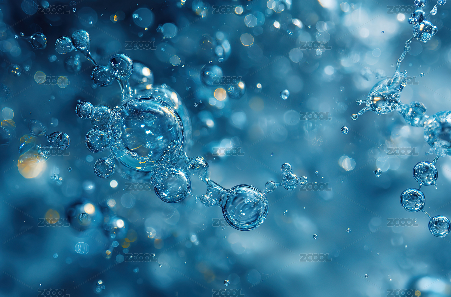 【AIGC】水滴水分子和气泡在蓝白色背景