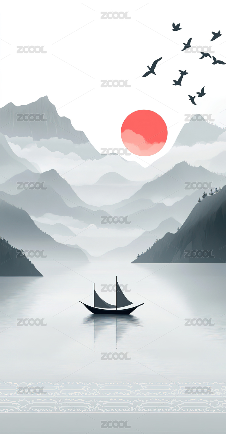 夕阳下孤舟泛于山水间