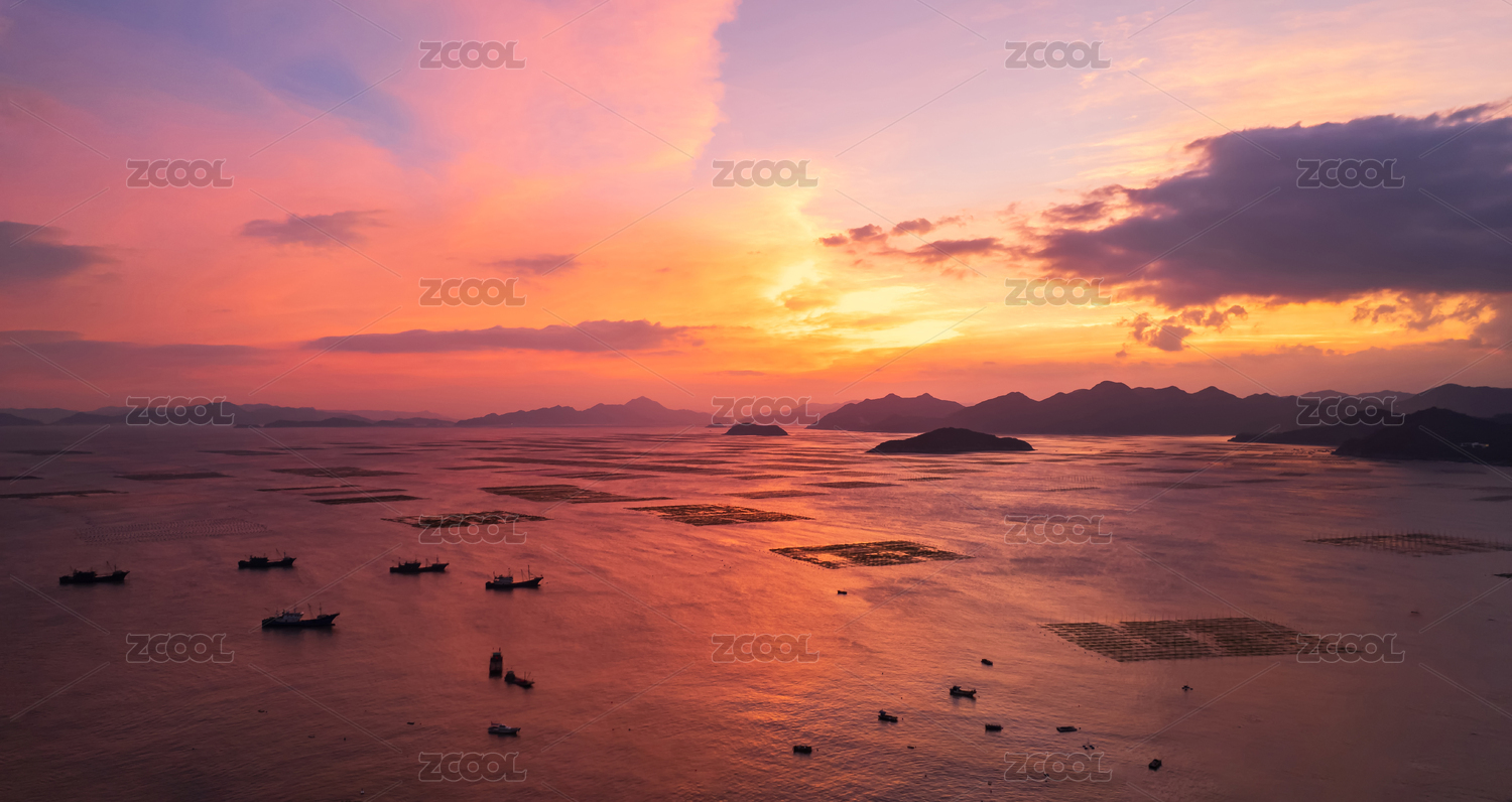 福建霞浦海洋养殖场日落风景