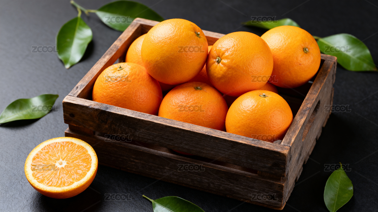 木质箱装橙子配绿叶