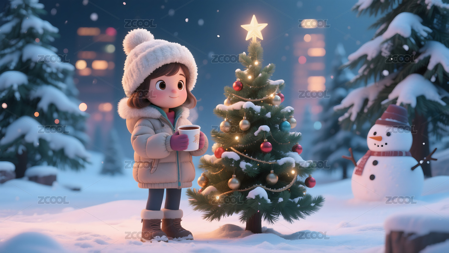 圣诞小女孩雪地热巧克力场景