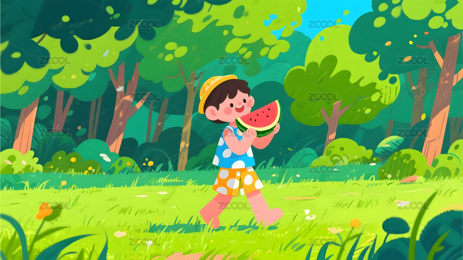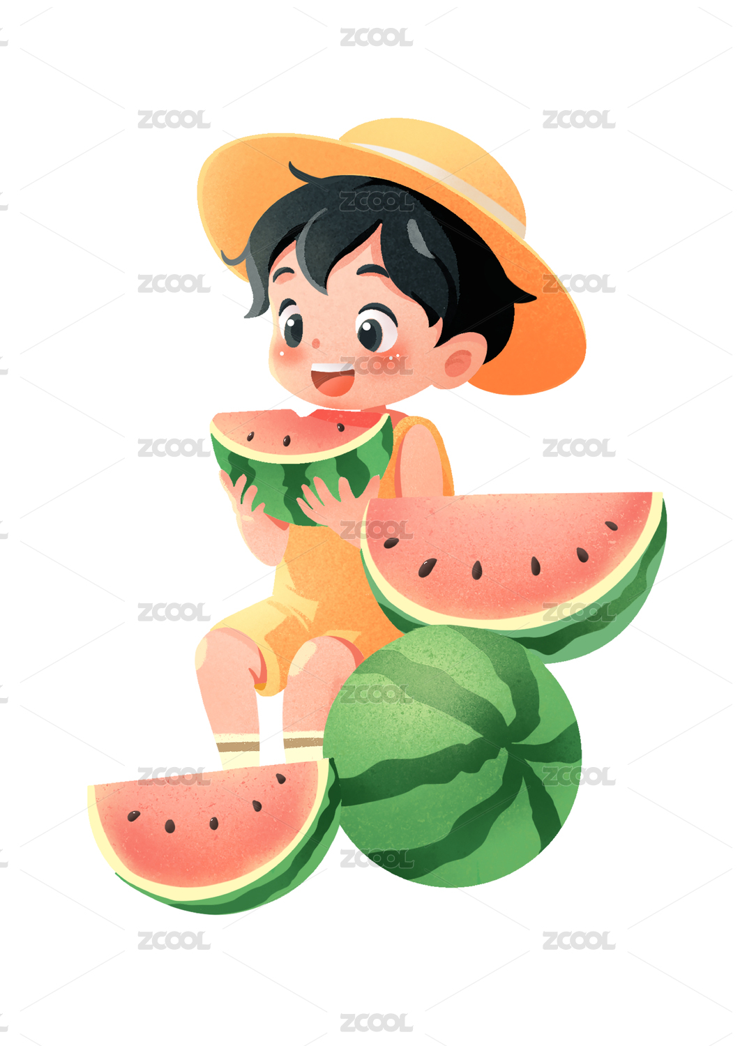 夏天吃西瓜的可爱儿童孩子卡通插画