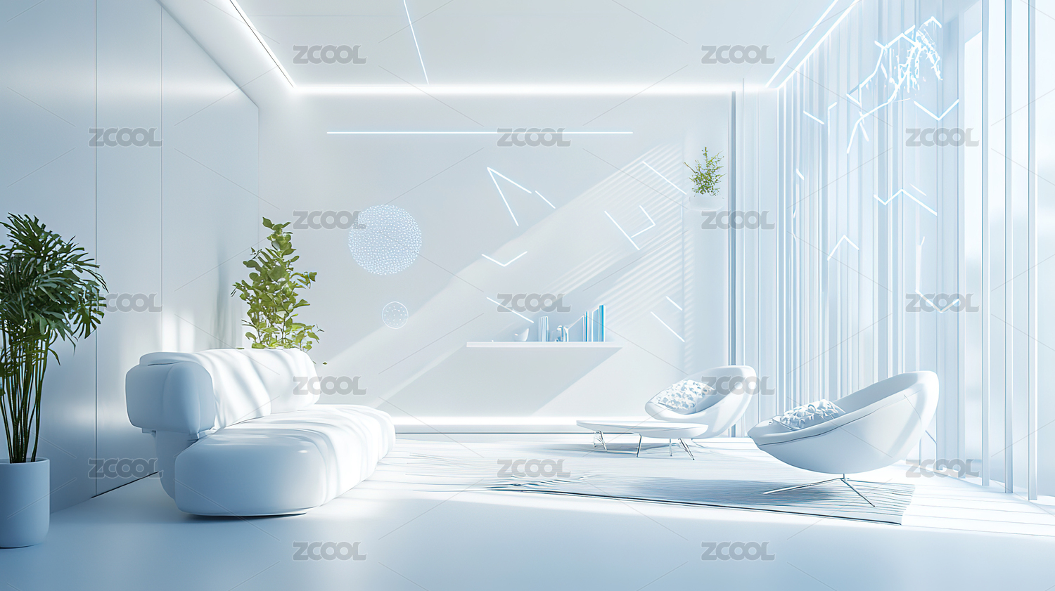 白色,灰色,白色家具,房间,圆形,透明玻璃桌子,桌上,水瓶,绿色植物,沙发