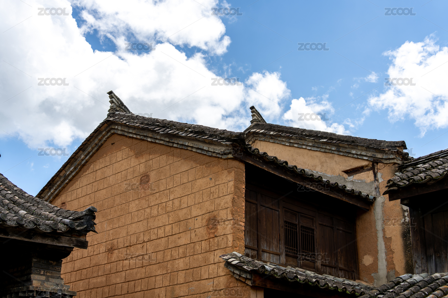 中式瓦片屋顶与蓝天白云