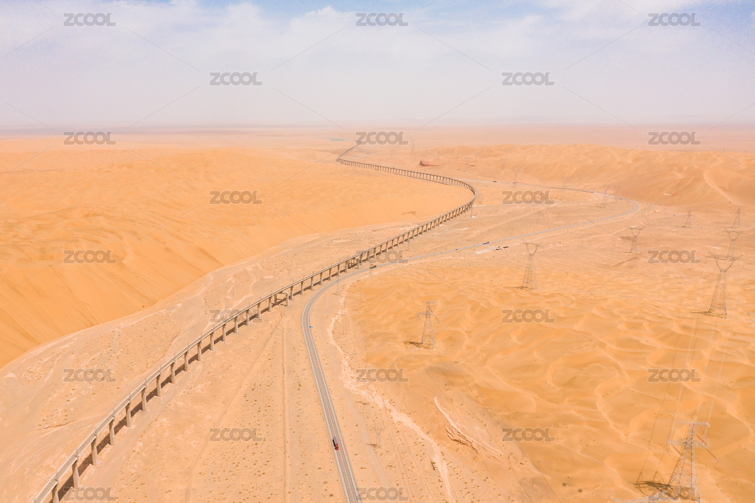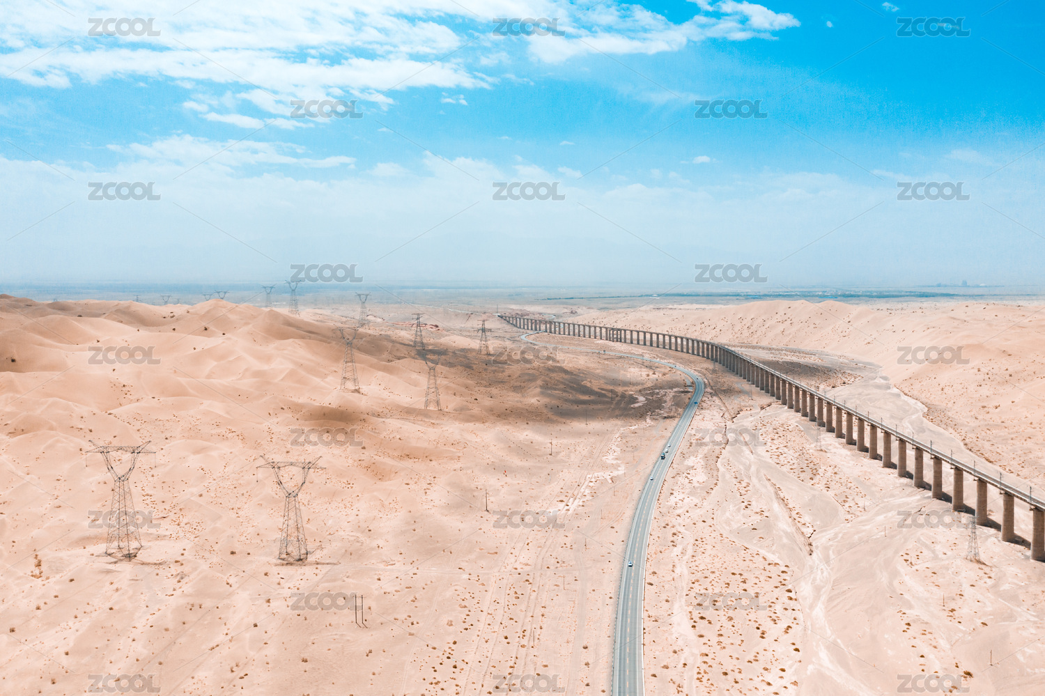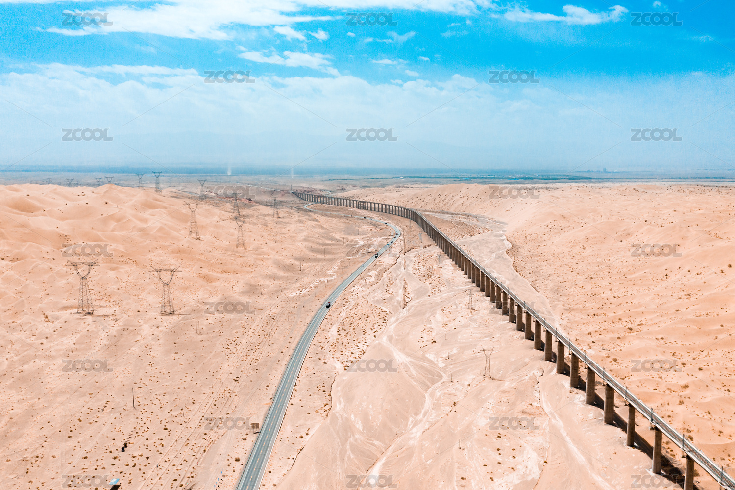 中国荒漠中的公路与沙土沟特大桥铁路